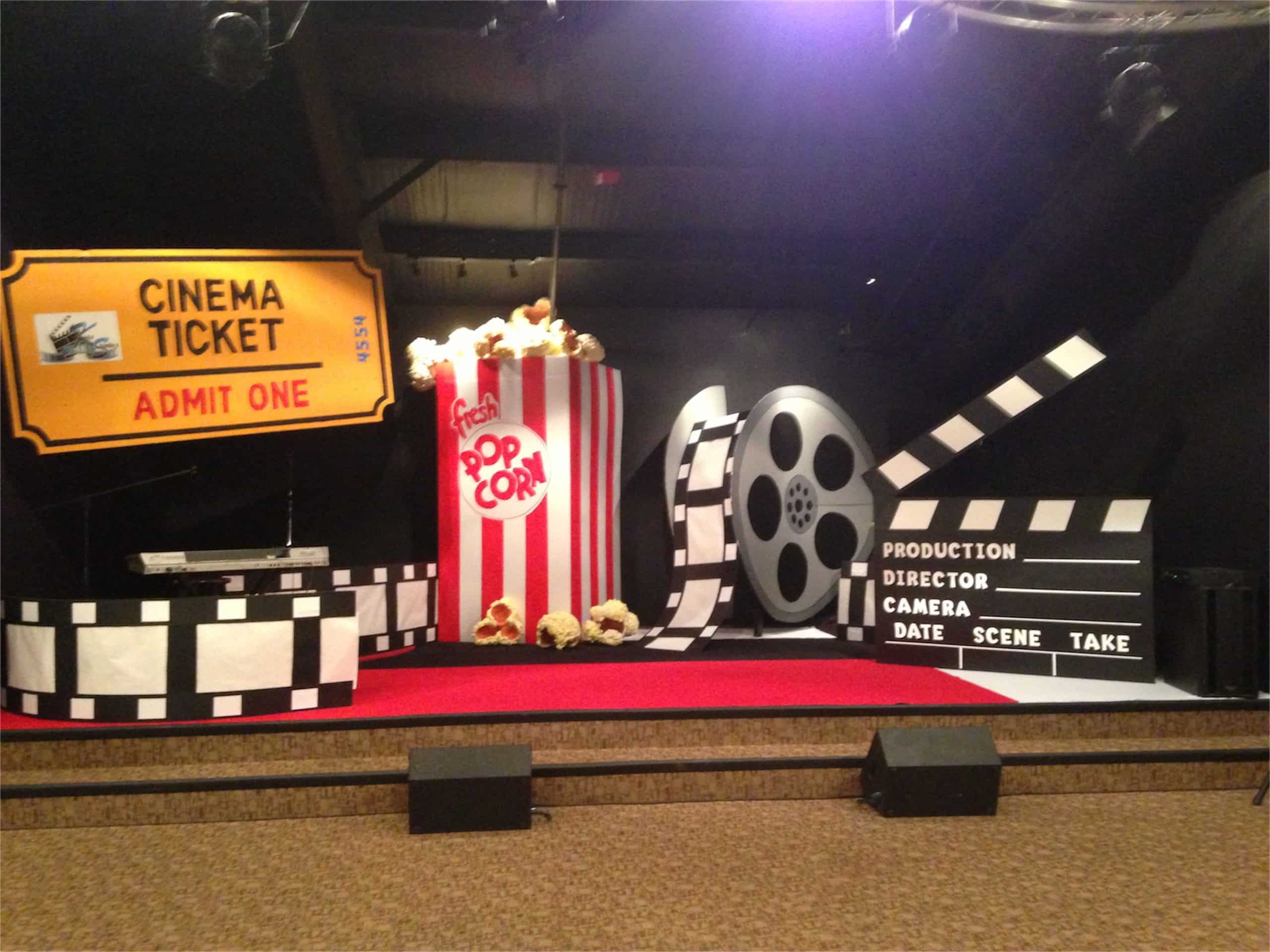 With church productions becoming more cinematic, many ministries also stream themed sets like this to online audiences using IPTV platforms making it possible to share creative environments with remote families. And of course, no movie would be complete without the movie film strip itself. This was created by cutting 6 inch by 8ft cork board so they could achieve bends that looked realistic. Framed by more 6 inch strips to divide the frames, painted black and then on the backside, 18 inch craft paper was doubled and taped to the back using packing tape. Slightly rectangular white copy paper was cut and glued to the front, then each 8ft section was secured to either the walls or 2×4 frames of another prop. Red carpet (borrowed), and cheap black and white material covered the floor of the stage.