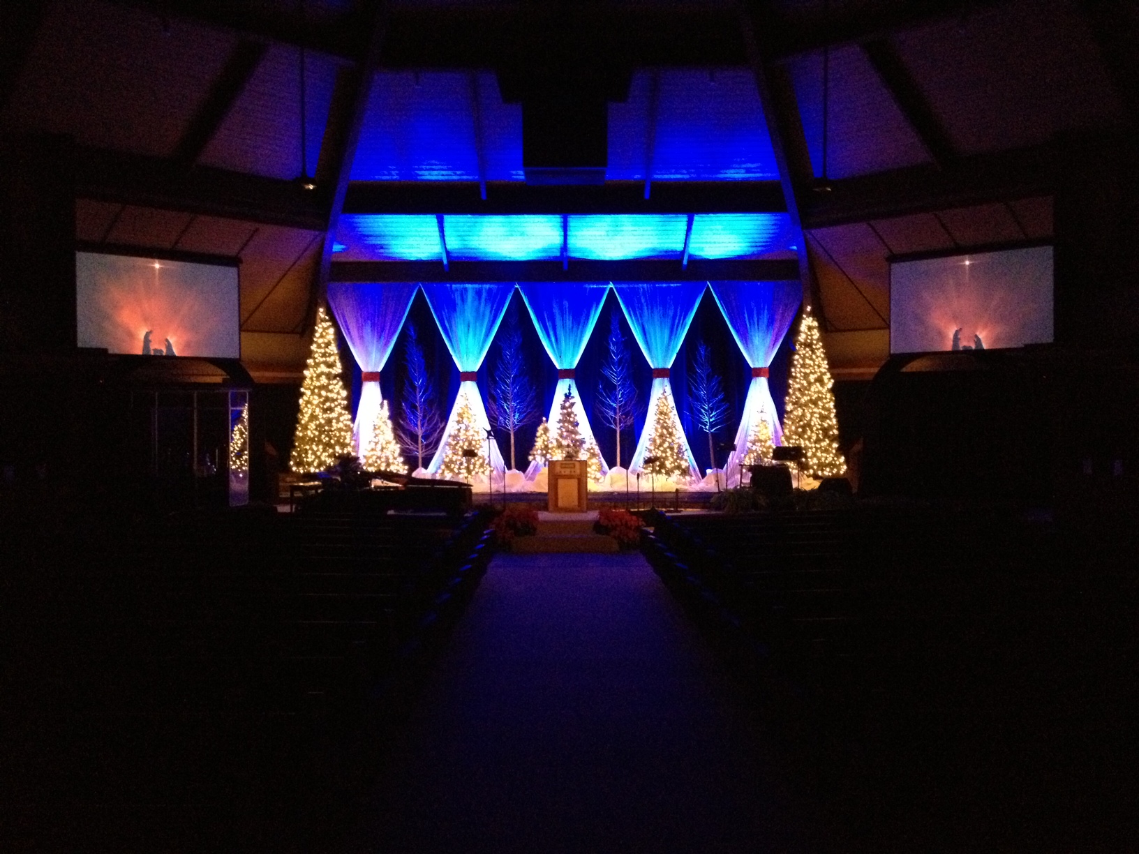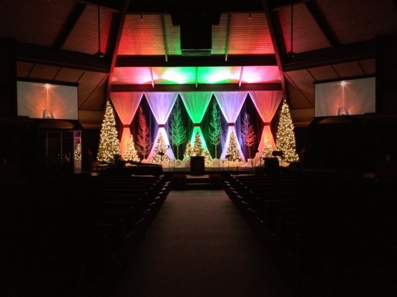 Chad E. Smith from First Southern Baptist Church in Bryant, AR brings us these colorfully lit fabric drops and trees.