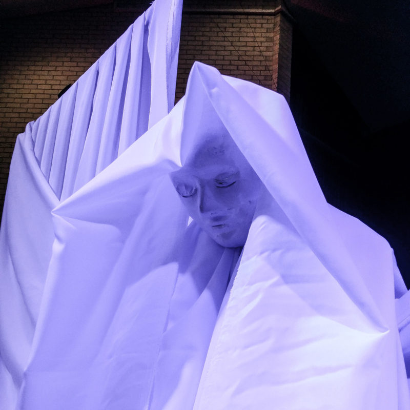 Because the angels were completely made out of white material with a white face mask we chose to keep the remainder of the stage black with no other design elements other than lighting.