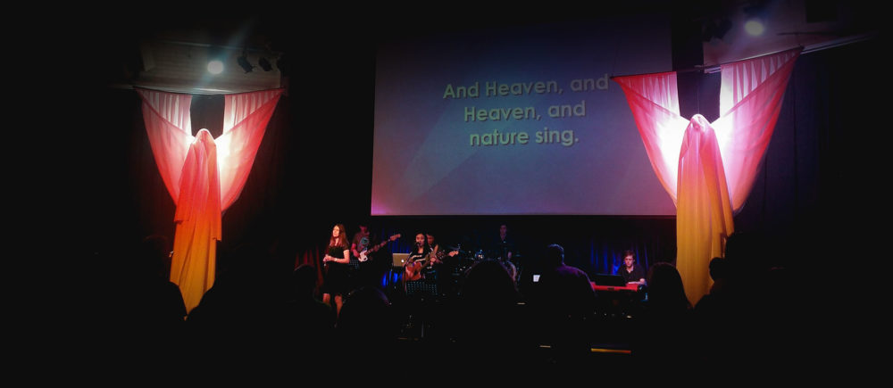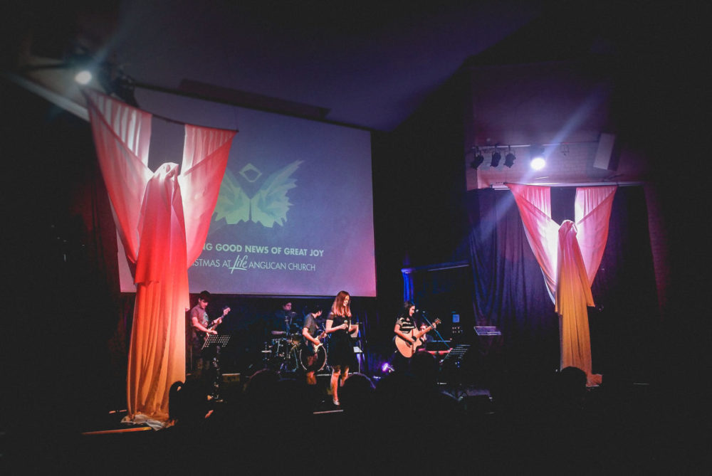 From Daniel: We desired to create a friendly atmosphere that welcomed people to celebrate Christmas together while at the same time not sanitizing the image of the angels from the Christmas narrative, mystical beings who clearly instill fear into everyone they appear before.