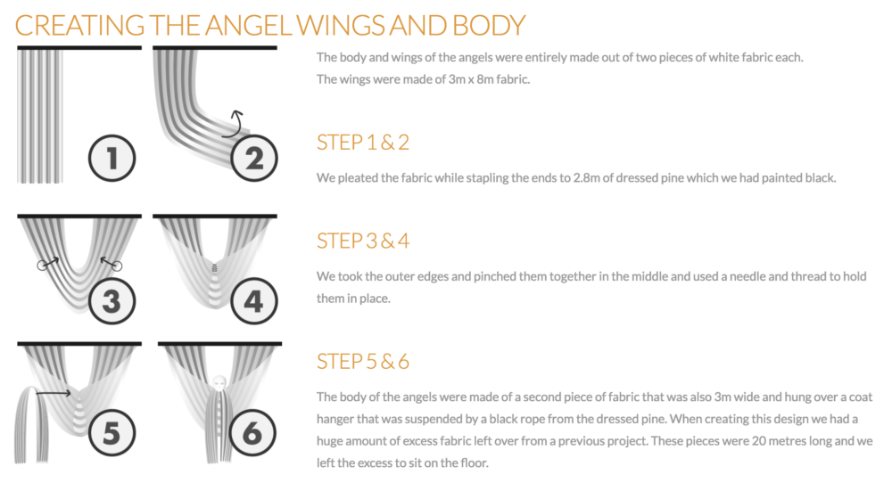 The wings were made of 3m wide fabric that was staple-gunned to 2.8m dressed pine which we painted black. We folded the fabric as we stapled it to create the pleats.