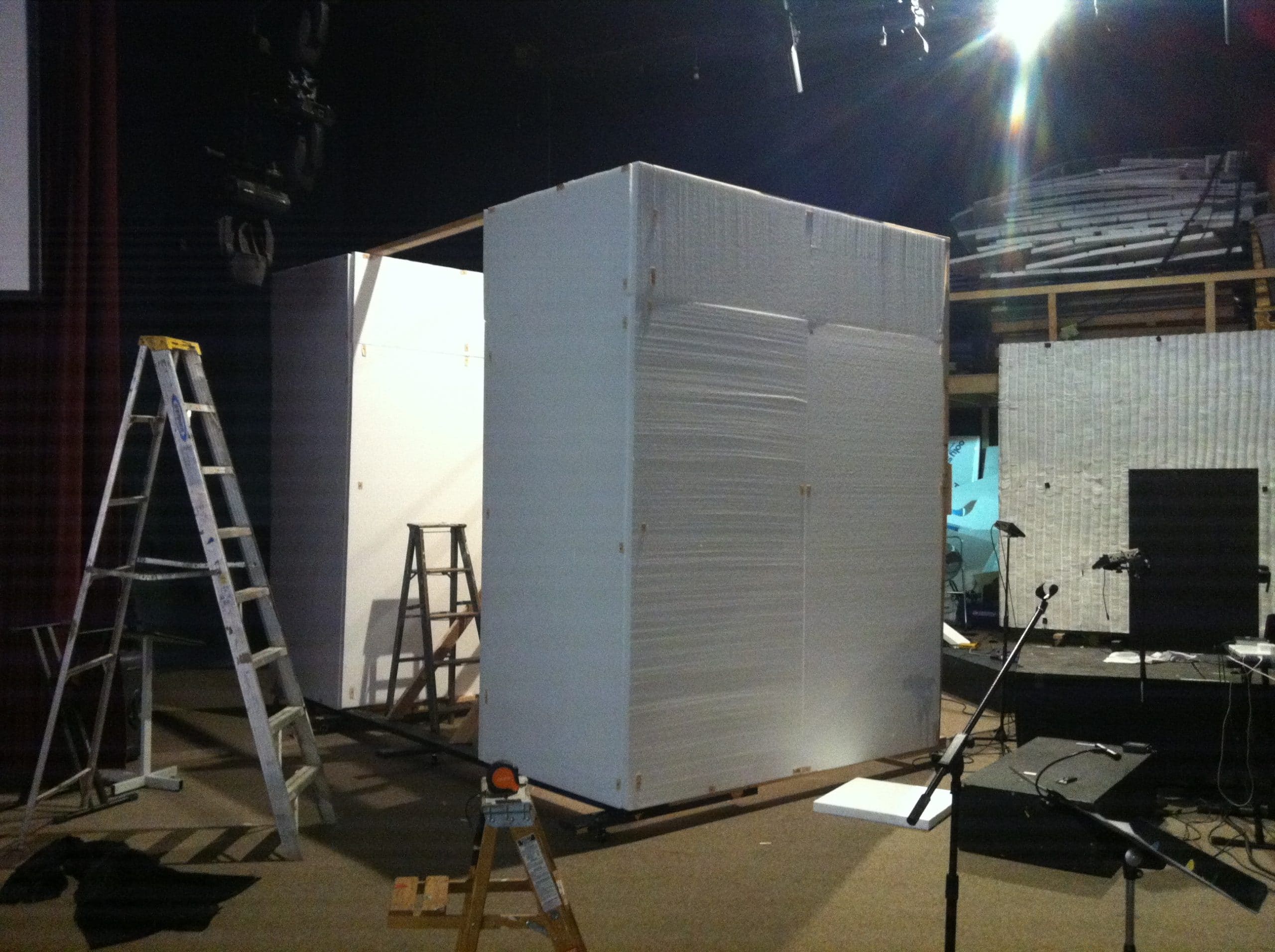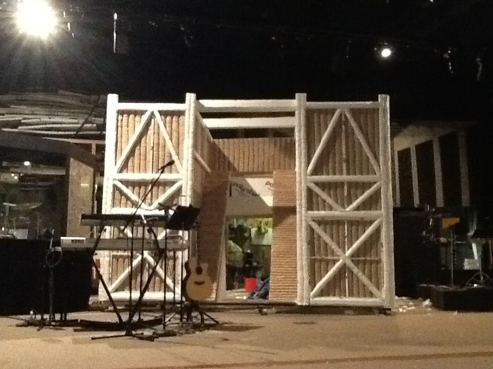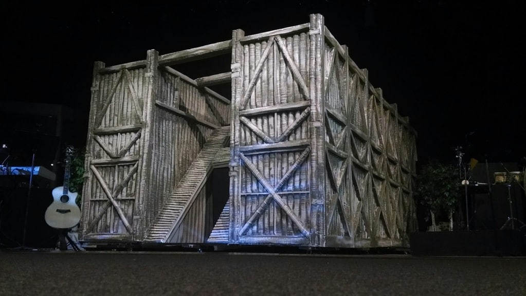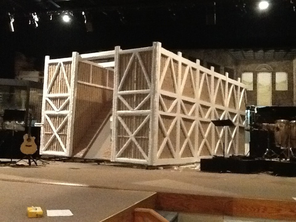 This set was made of 2 inch styrofoam. Frank used a hot wire knife bent in a half circle to the give appearance of wood logs. It was glued onto a frame made out of 2x4s then painted.