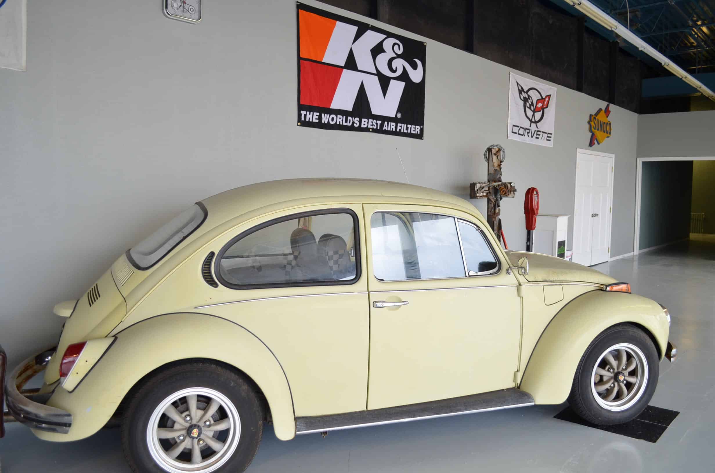 The back wall was painted as an American flag made out of wrenches. We projected and traced/painted this to make it easy to install. After these two jobs were done, we called every church member we knew that was a car enthusiast looking to borrow anything car related they had. We added toolboxes, gas cans, a motorcycle, signs, etc. to fill the stage and get that garage look. We set up a place in our foyer using an actual Volkswagen Bug to help promote the series.
