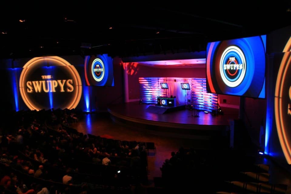 The columns on the walls were lit with LED fixtures. Six 8′ columns were created with two pieces of barn skylight material and lit with LED fixtures. The SWUPYS logos were projected from the balcony using gobos in two Source Four fixtures.