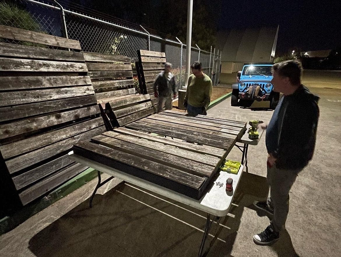 He couldn’t afford all the wood for their Easter set, so he tore down his old fence to make it a distressed wood vibe.