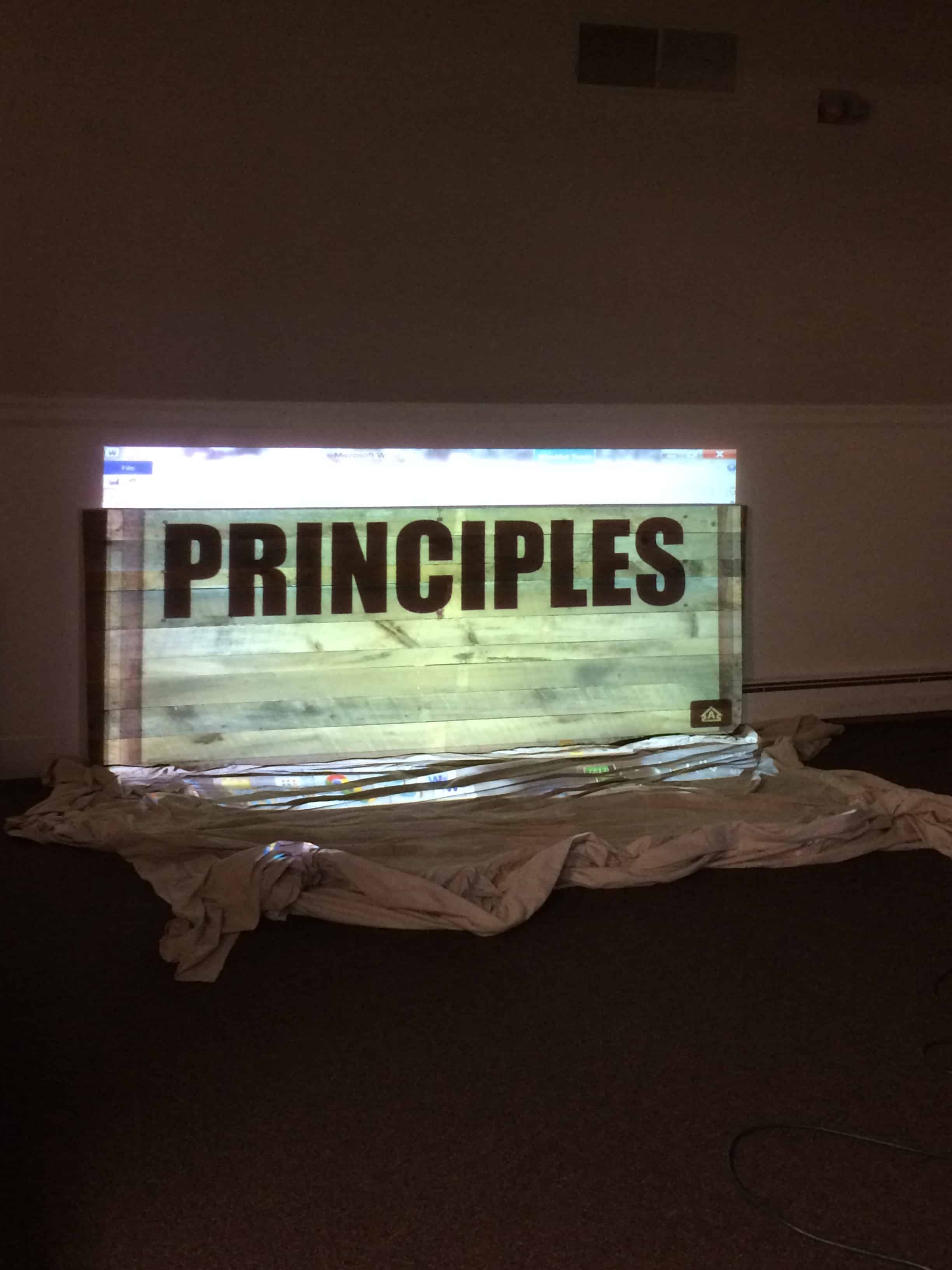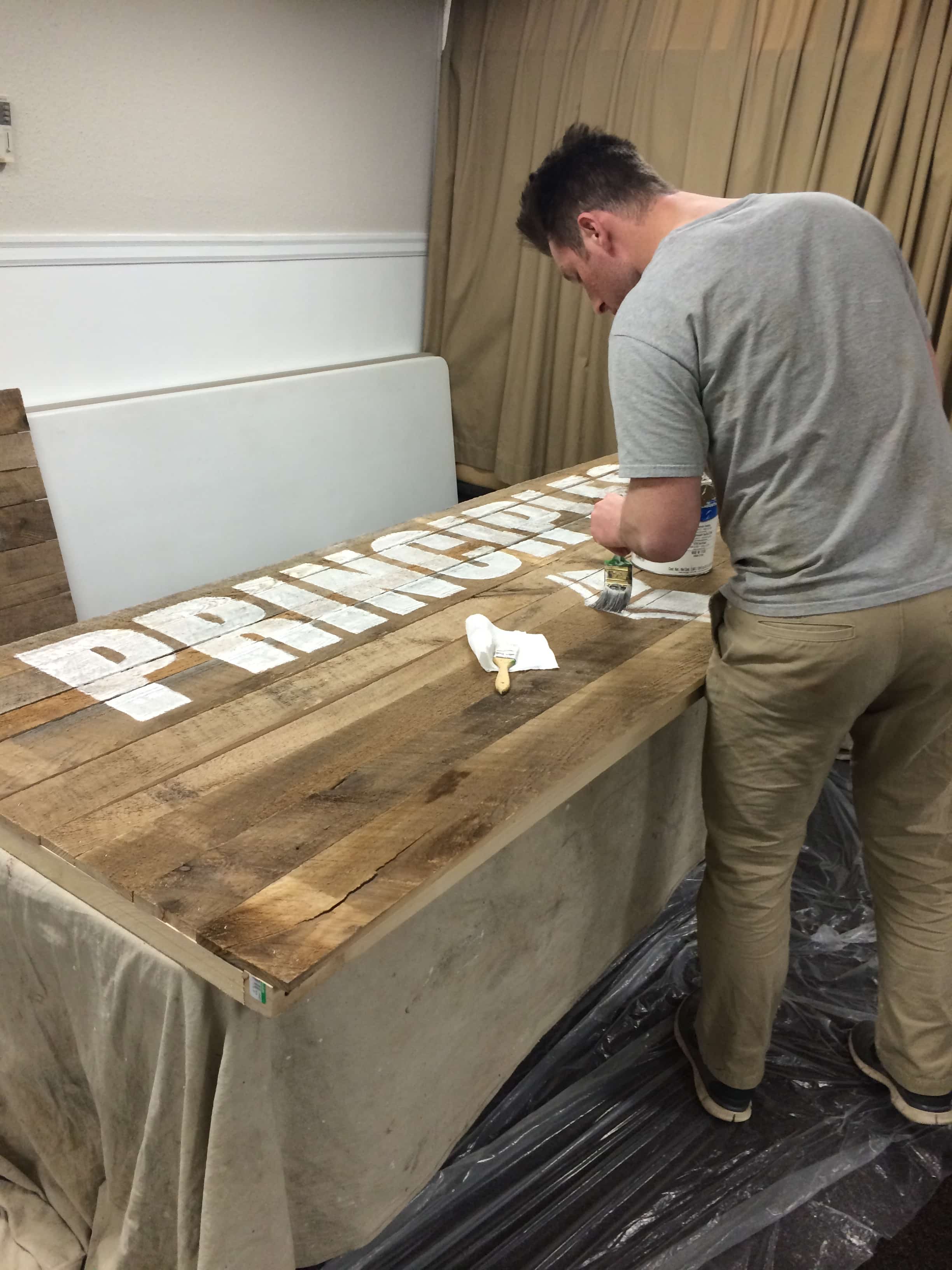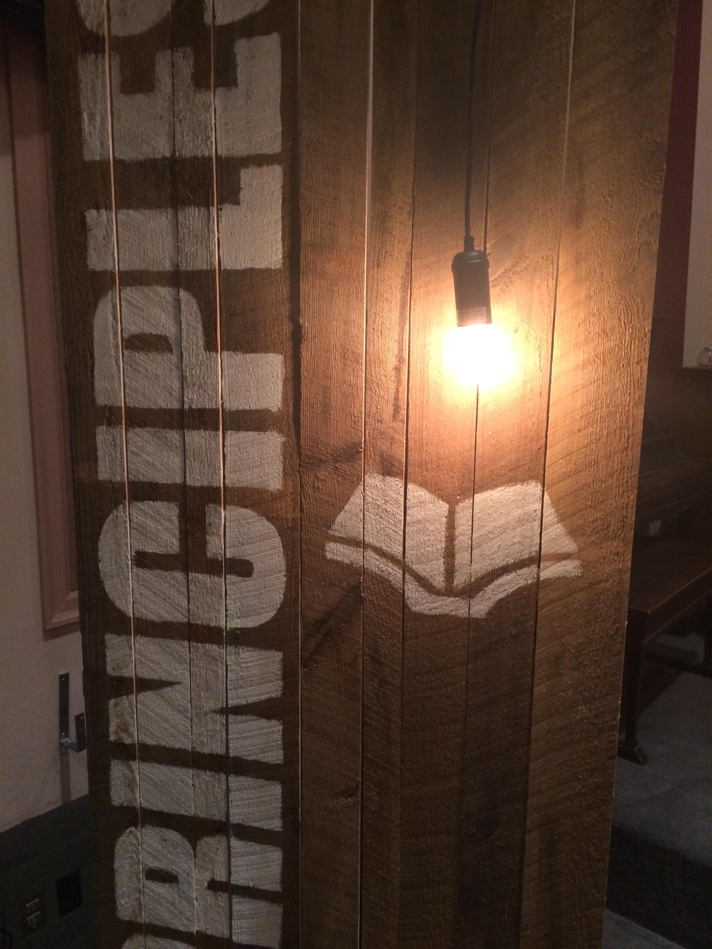 Matt bought a pile of weathered hickory from a local lumber mill and cut them down to 4″Wx8’Lx1/2″ thick. He then stapled them to a 2″x2″ frame that was 3’Wx8’high. He used a projector to get the font he wanted and traced the letters and icon with a white paint marker. He mixed a flat white paint 30/70 water mixture to fill in the words.