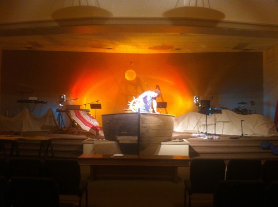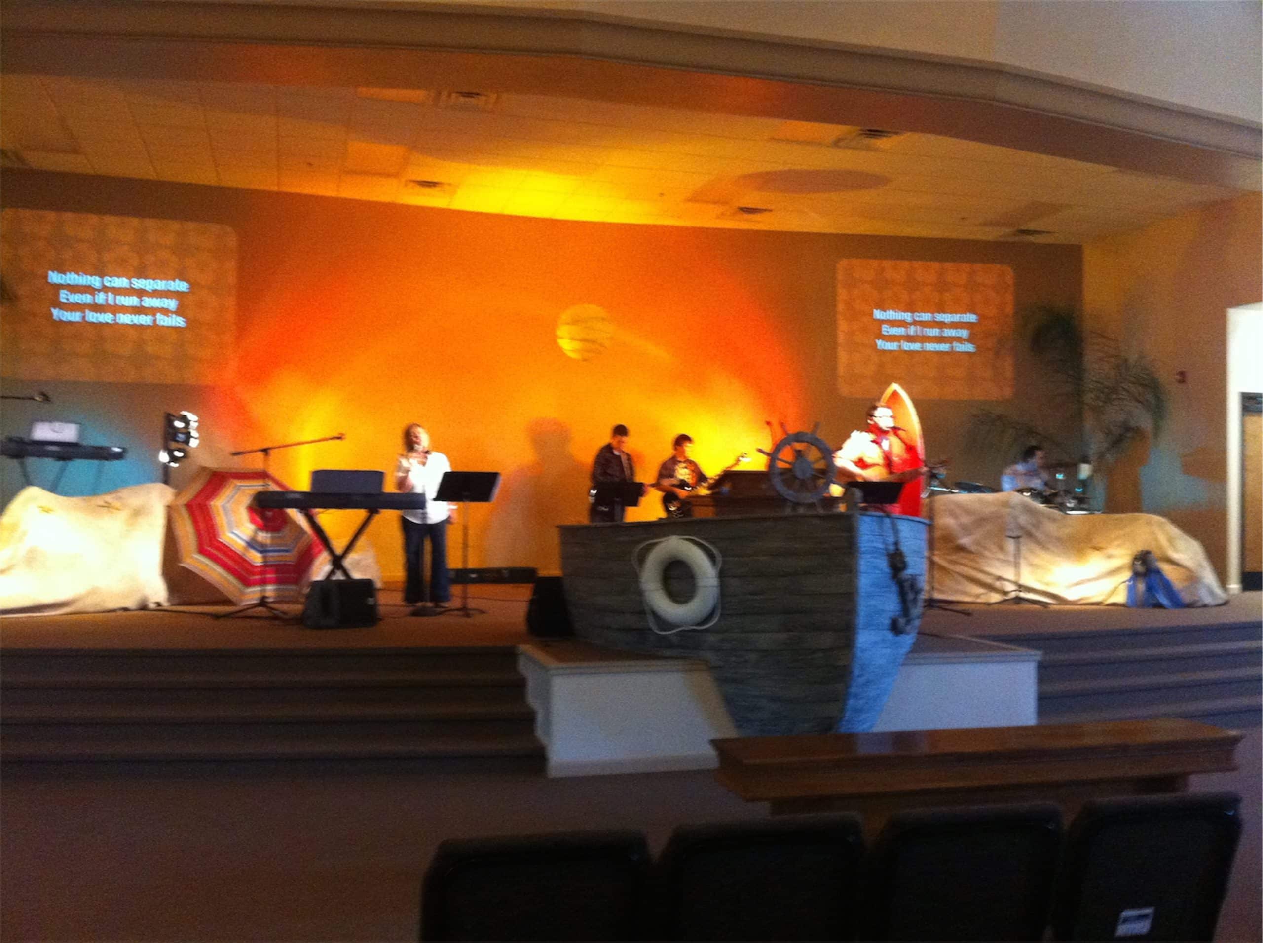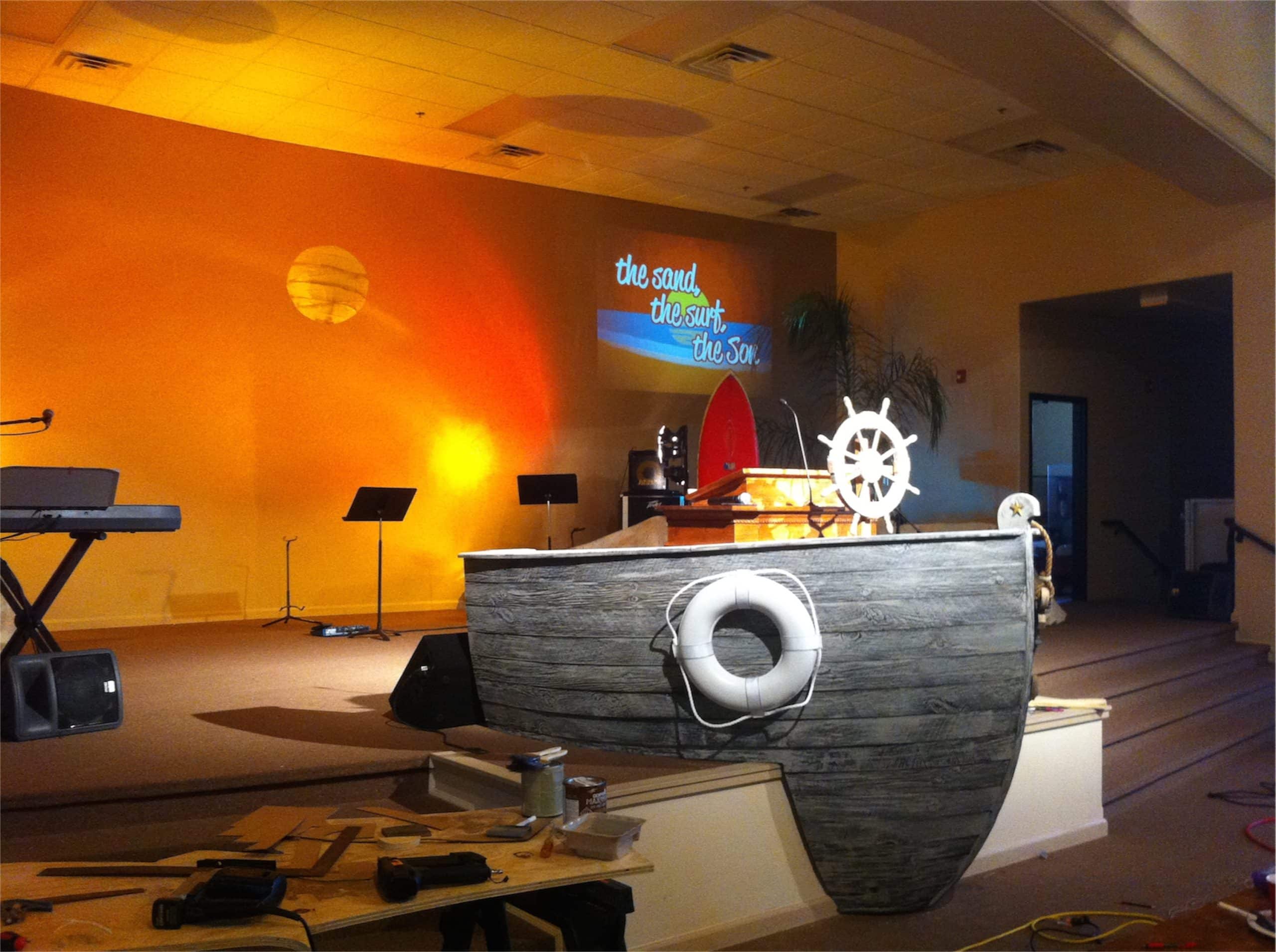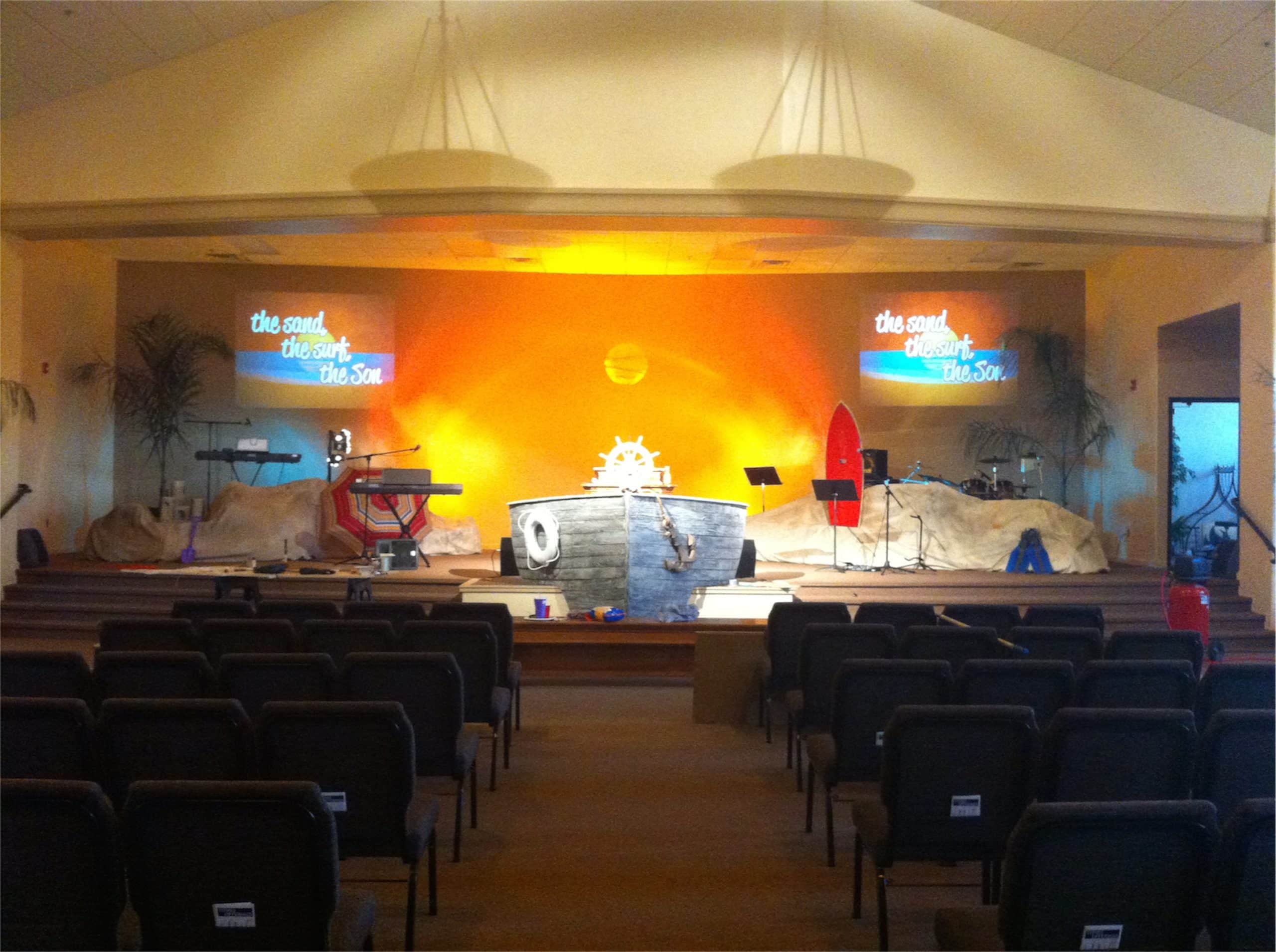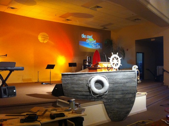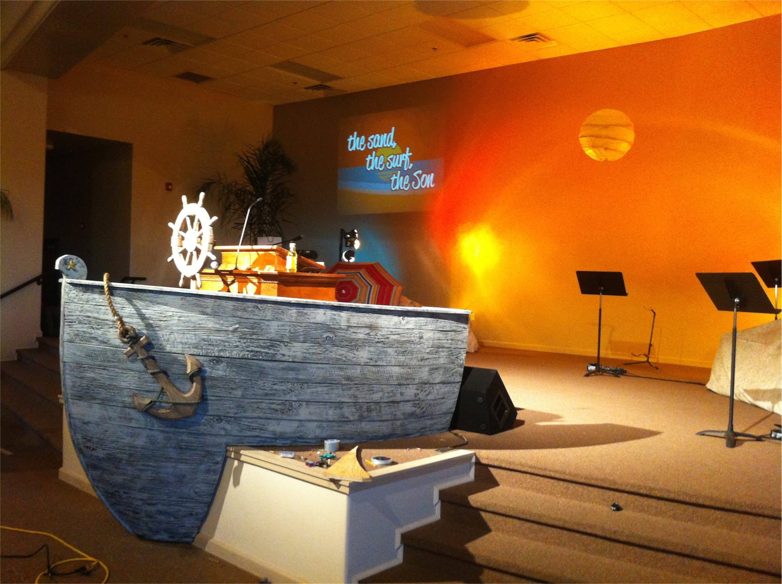 Tim Anderson from Calvary Worship Center in Visalia, CA brings us this beachy stage design for their VBS.