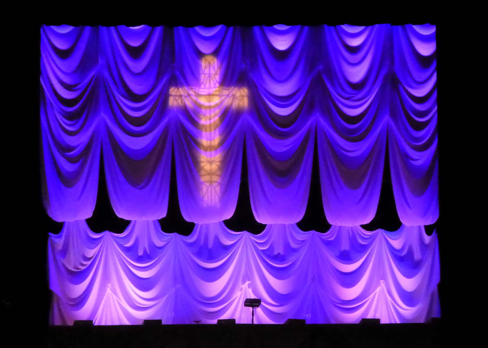 They had 12 pieces of 5′ wide by 33′ long white fabric left from previous sets and hung 6 on each stage edge to edge. The fabric was attached at the top to a horizontal truss (actually radio tower sections used as truss suspended with steel cable) and gathered up on the sides using black tie line to create texture. The fabric was then brought back and up over a horizontal pipe and dropped to the stage floor with more tie line attached for texture on these sections. They lit the fabric from above and below as well as front and back with LED lights from their inventory (using every LED fixture they had). These included a row of Chauvet COLORado 1-Tri Tours on the floor front and back. On the top they used rows of Chauvet COLORband Pix fixtures front and back. Then they added some lighting texture with ETC Source Four ellipsoidal fixtures with gobos and color scrollers.