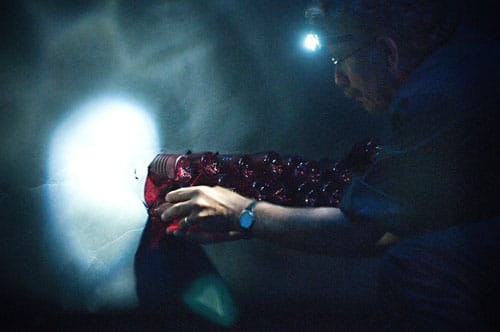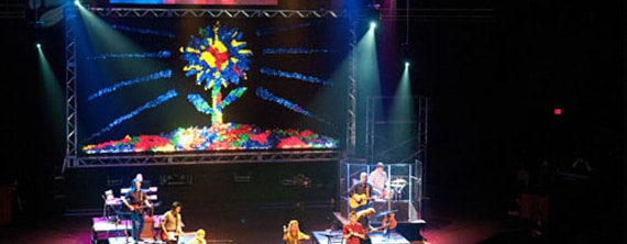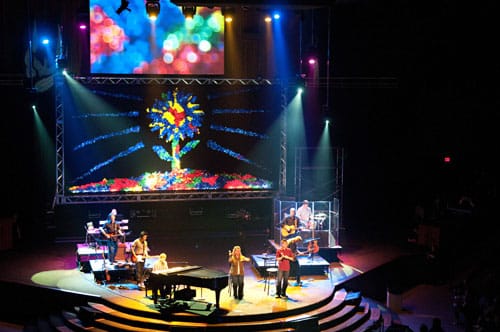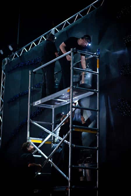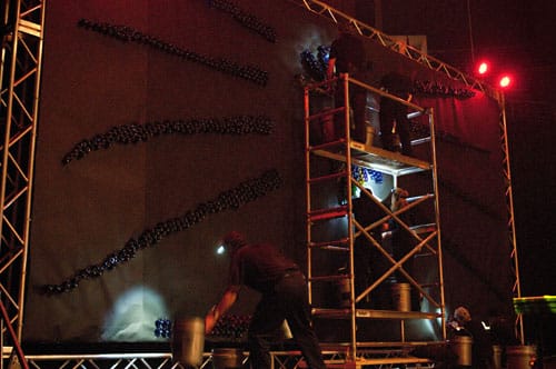 During the worship set, there were workers on stage pushing the bottles into a chain link fence stretched across a truss frame. This part of the stage remained in darkness. The people in the audience could only see the workers and their headlamps.