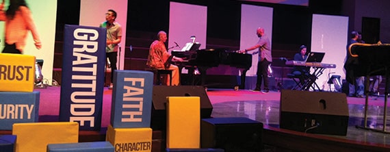 The biggest challenge in their sanctuary is creating a smaller, more intimate atmosphere. They have a very high ceiling and deep stage with five rows of stairs in the back. They wanted to try to contemporize their stage and bring some new design elements for a special series they were doing. Because they had a very small budget, they used 4′ x 8′ pieces of white foam core to create reflective panels that would cut the depth of the stage in half. Each panel cost about $11. They screwed the bottom of each panel directly into the stairs and used black gaff tape and black foam core strips to create supports on the back of each one. Using black helped the supports disappear. The white panels reflected the LED lights from above, and they also had can lights shooting up at each panel to create more contrast and variety during the service.