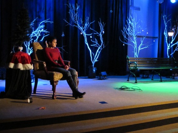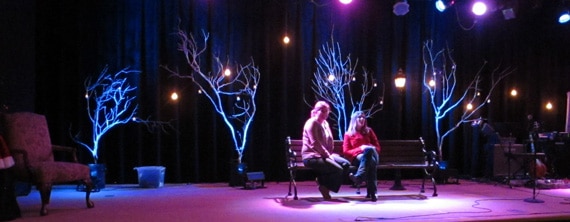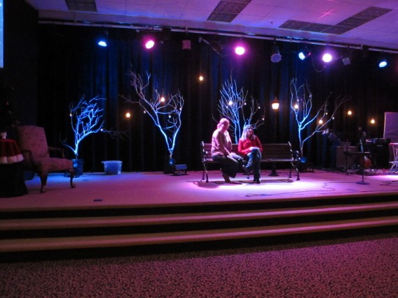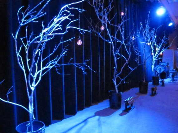 They hung small battery operated tea lights on each tree and hung light bulbs from the ceiling that they controlled from the tech booth. The trees were lighted with LED’s that they placed at the bottom so they had multiple colors to choose from. They paired it with a bench and a lamp post that they had in storage to create a Narnia look for a short drama.
