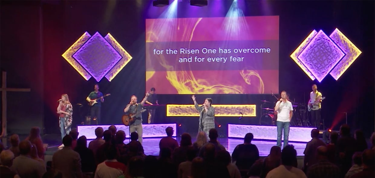 From Steven: When designing this set, I knew it was going to be up for a few different series that our church was going through so I wanted it to be dynamic and adaptable. It came together with the help of an amazing volunteer team and influences from Crossroads Community Church in Vancouver, WA and NewSpring Church in Greenwood, SC. This set took us about 3 days to build and around 150 man hours. We had done a few different sets with Coroplast, and while I love the color gradients you are able to achieve with smooth surfaces I really wanted to do something with depth and texture. Thats when I saw the “Coming in Waves” set that NewSpring did. That led me to amazon where I found a wide assortment of 3d textured panels for a reasonable price 12x 20″ by 20″ tiles for ~$80. After purchasing those, I started to look around at different designs and orientations that I could put them in. I recently had visited Crossroads Community in Vancouver and remembered a really unique set that they did using video wall that I thought would play nice with these tiles.