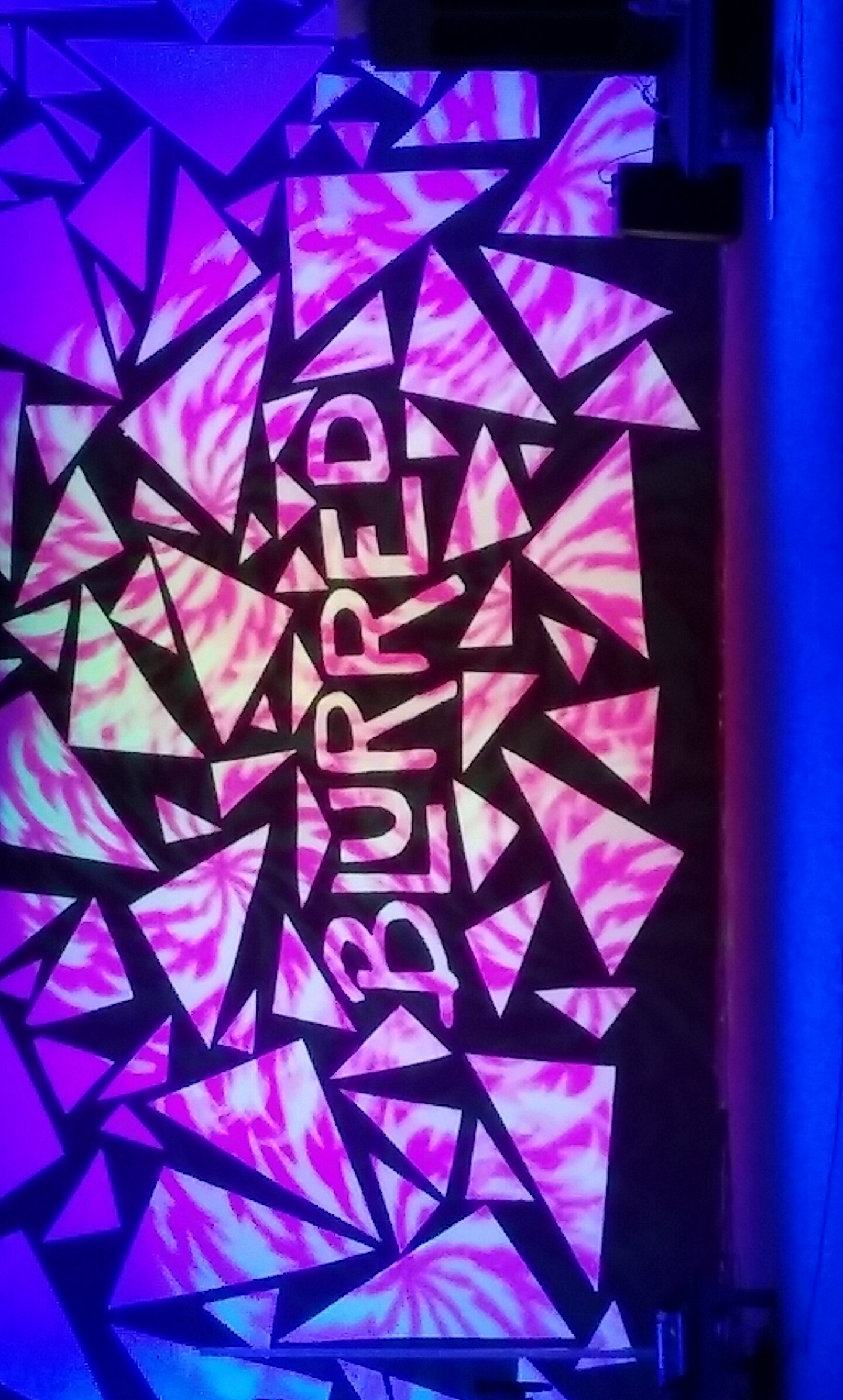 This was a very simple design that took their team a total of 4 hours to complete and it was inexpensive. They purchased 14 sheets of 4X8 foam board for $140 from Lowes. They used one of the sheets to cut out their letters and then cut the other 13 sheets at random. They started at the center and worked their way out. It was lit with 4 battens and 14 LED pars.