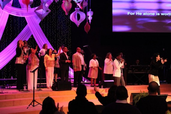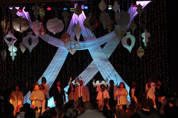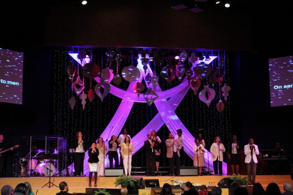 Chase Austin from Champions Community Church in Houston, TX brings us this great Christmas stage design incorporating cardboard ornaments. (Originally posted January 2013)