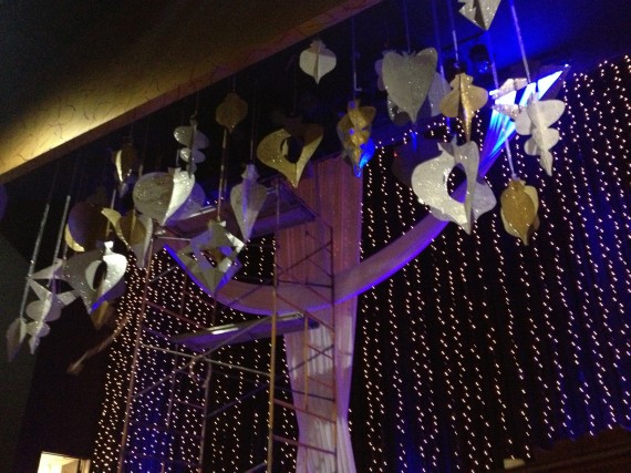 They started with a giant black curtain draped along the back wall of their stage. Then they hung strands of Christmas lights vertically from the ceiling truss. One of their guys created a cable that would allow them to plug them into their dimmer box and control them from the light board.