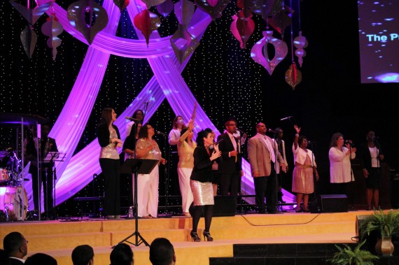 Finally they hung ornaments from the ceiling grid around the light truss. The ornaments were made from cardboard boxes that were donated by people in the church. Designs were drawn and cut while the boxes were flat, which created a perfect replica of each ornament shape. They painted them in shades of gold, silver, and white and applied glitter to the paint as it was drying. After they were dry, they made them three dimensional by cutting a notch in the middle of each pair of ornaments and fitting the pair together. Lastly, they hung them with ribbon from a local craft store.