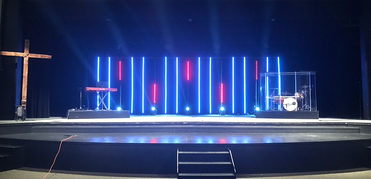 Kevin Barringer from Calvary Community Church in Sumner, Washington brings us this awesome stage lighting setup. To create this design, they diffused LED tape in vertical columns, then added color bars and moving li...