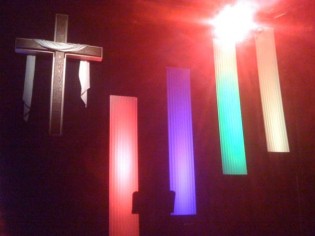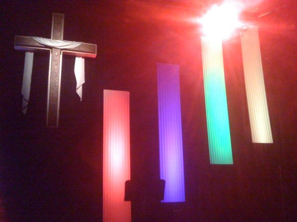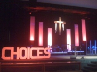 The Choices logo was created a series their pastor was doing. They made the choices sign out of 4″ styrofoam cut with a saw and sanded smooth. They glued the letters to a 2×1 to attach them all together. This allowed them to move the logo whenever they needed. The Choices sign is lit from a front bar with a fresnel and a gel.