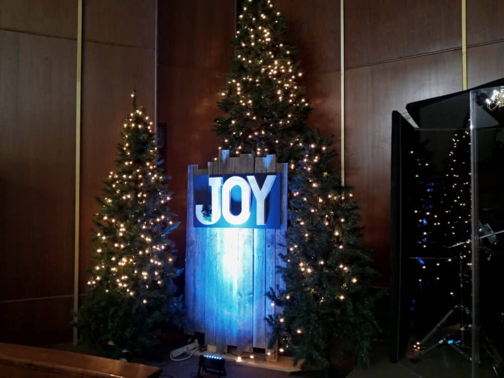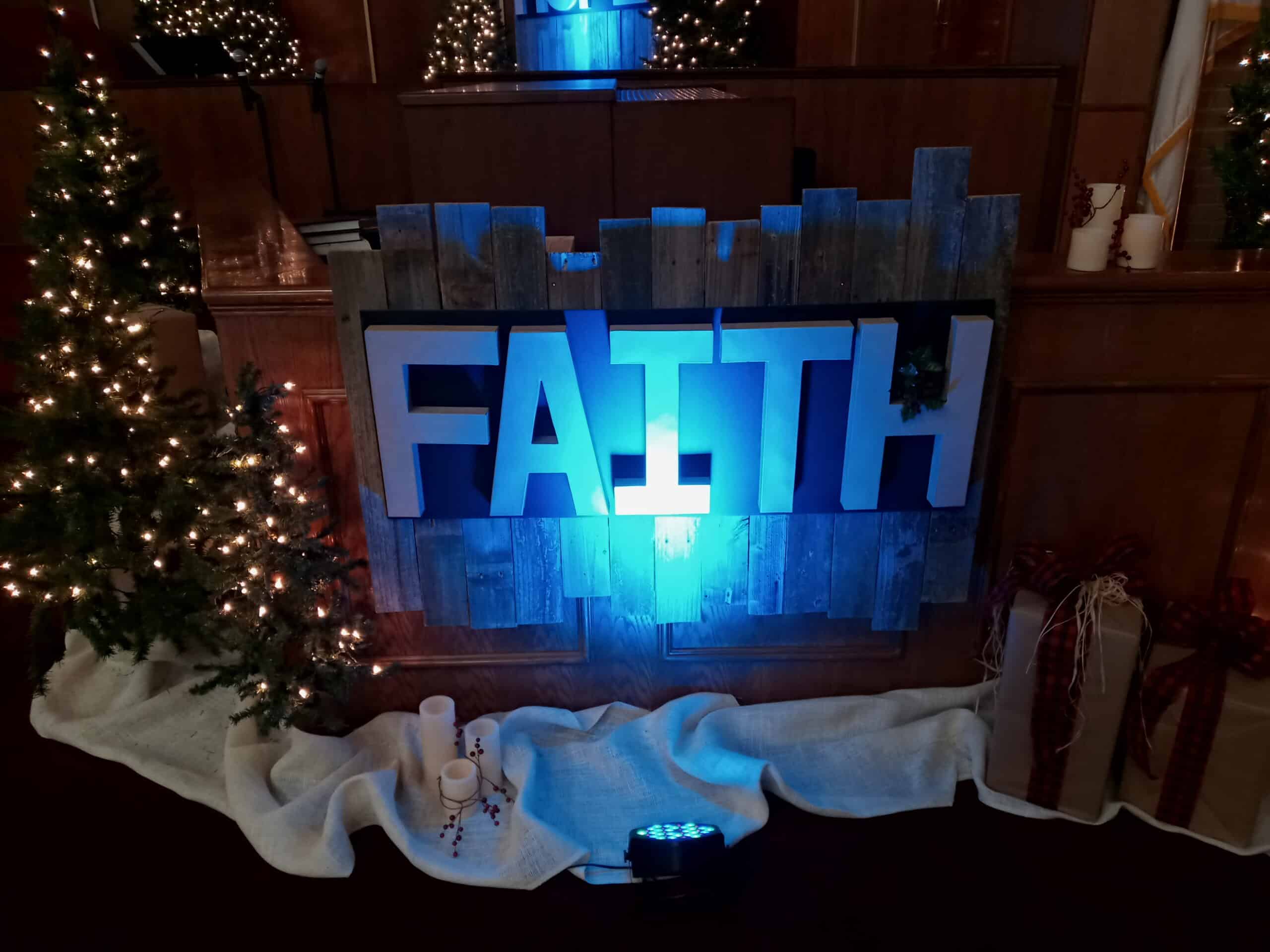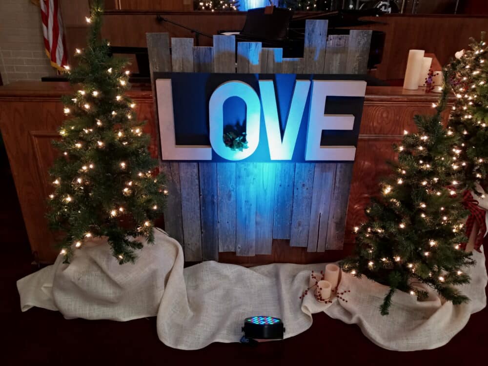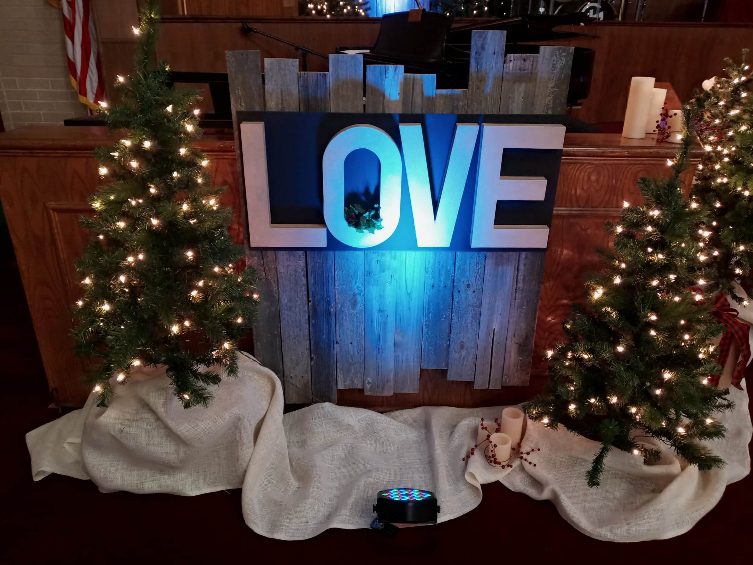 They used barn wood, artificial Christmas trees (18,) battery operated candles of various heights, burlap to cover the bases, boxes used to put the trees on different levels, and 4 LED Par cans for lighting accent on the words. They mounted the 16″ letters on black craft board and hung them on the barn wood panels.