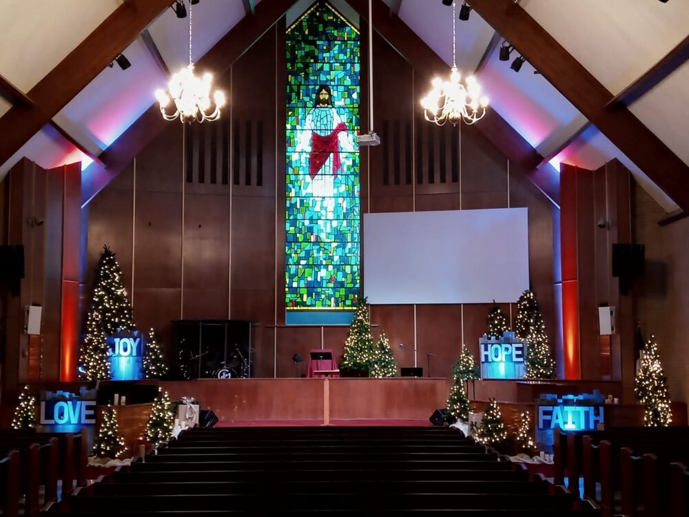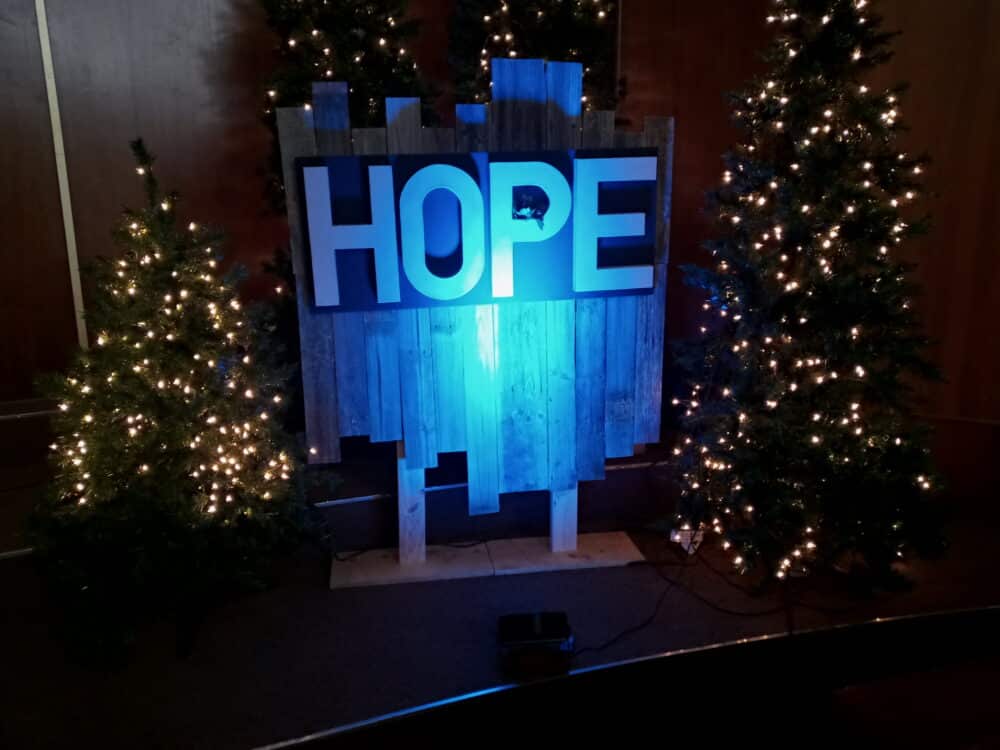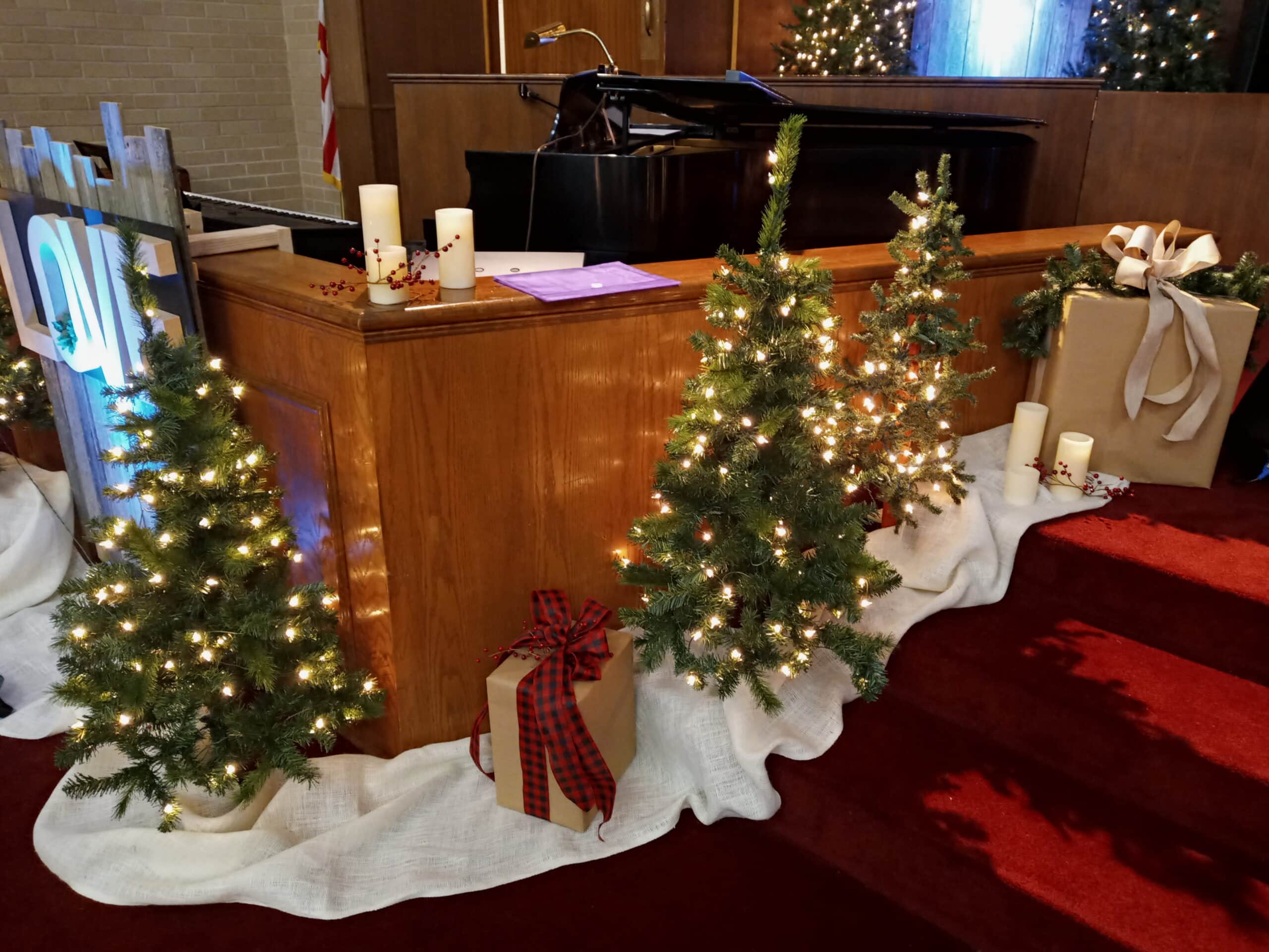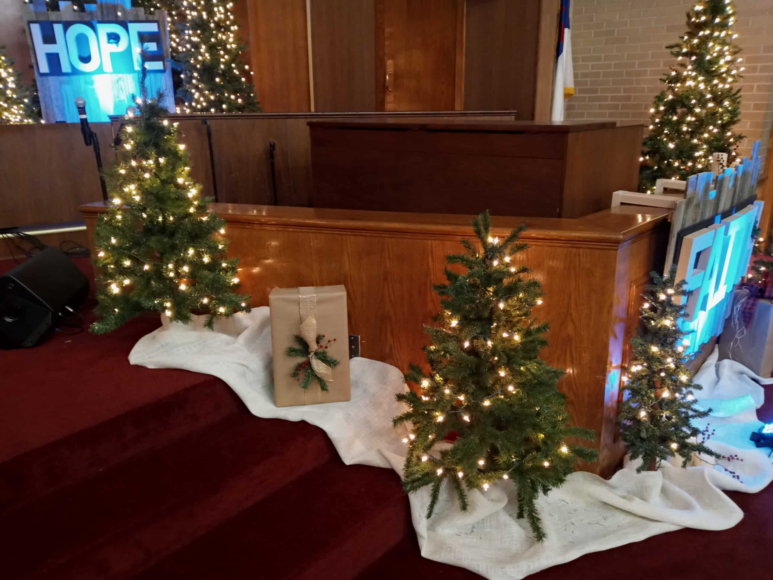 They used barn wood, artificial Christmas trees (18,) battery operated candles of various heights, burlap to cover the bases, boxes used to put the trees on different levels, and 4 LED Par cans for lighting accent on the words. They mounted the 16″ letters on black craft board and hung them on the barn wood panels.