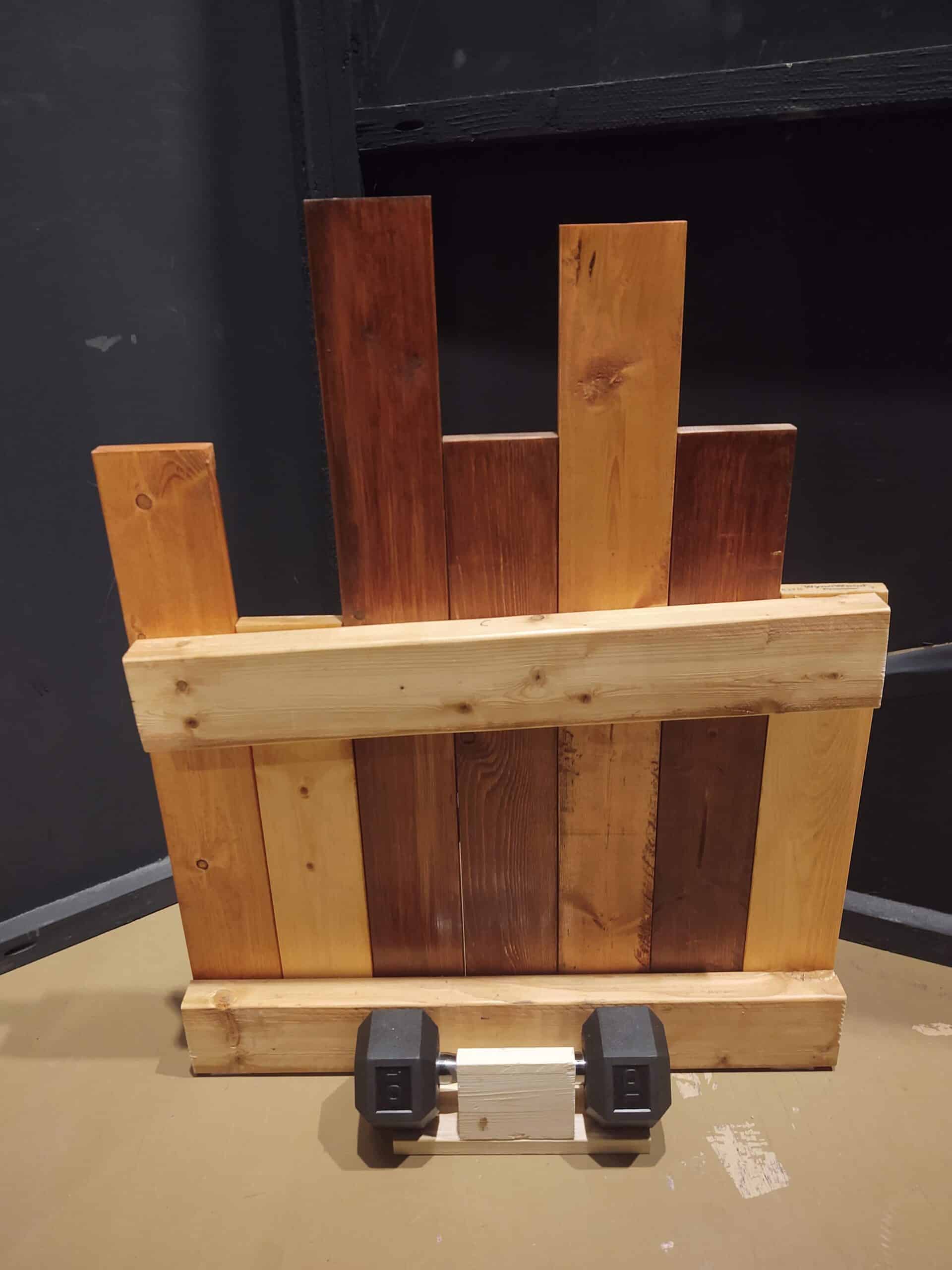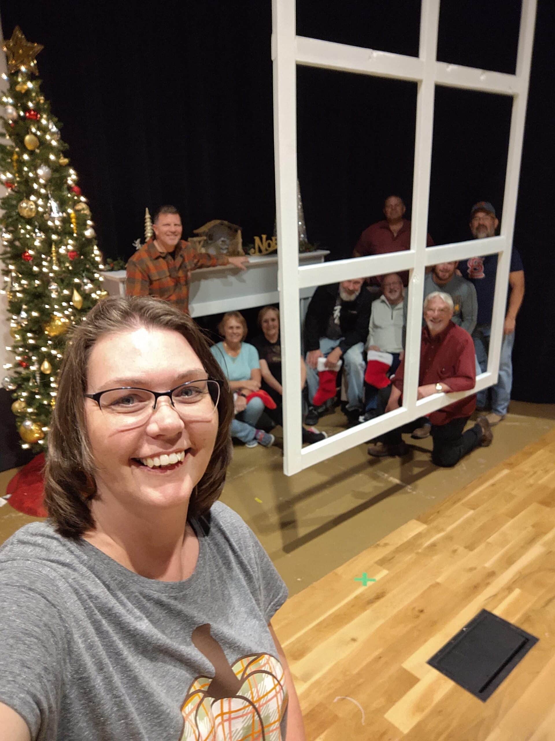 To complete the look, we added several 2’X4’ widows along the floor. We used painting plastic stretched and stapled to create a “window pane” and added the same outdoor tinsel to some o the props and lights to others. Then we took candle lights or bar lights and placed them on the backside. There are small 1X4s that make legs on the back and handheld weights (10 or 15lb) sitting on the boards to help keep them from falling over (see photo of set piece that doesn’t match, it was the only photo I could find showing the back). We already had this basic piece from another set, just added the set dressings and lights.