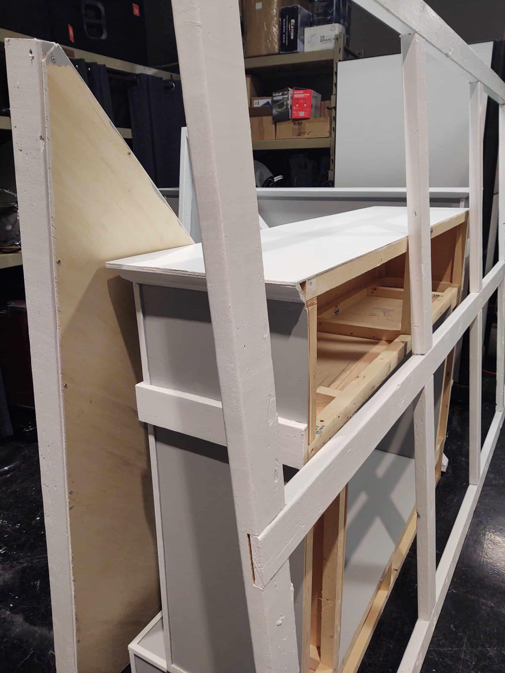 We created two large window frames out of 8’ 2×4 pieces (left over from other sets) The outside dimensions of the widow were roughly 4’X8’. To create more of a widow look we broke the frame up into roughly 2’ widow sections and painted it all white. We strung outside tinsel along the tops. We created dormers above the windows as you would see on the outside of a house. They were 8’ wide and the top of the triangle was roughly 3 ft from the base. We used 2×4 but this time on their edge to create depth back to the particle board. We painted it white and added outdoor icicle lights and a lighted wreath with a red bow (to match the tinsel on the widow).