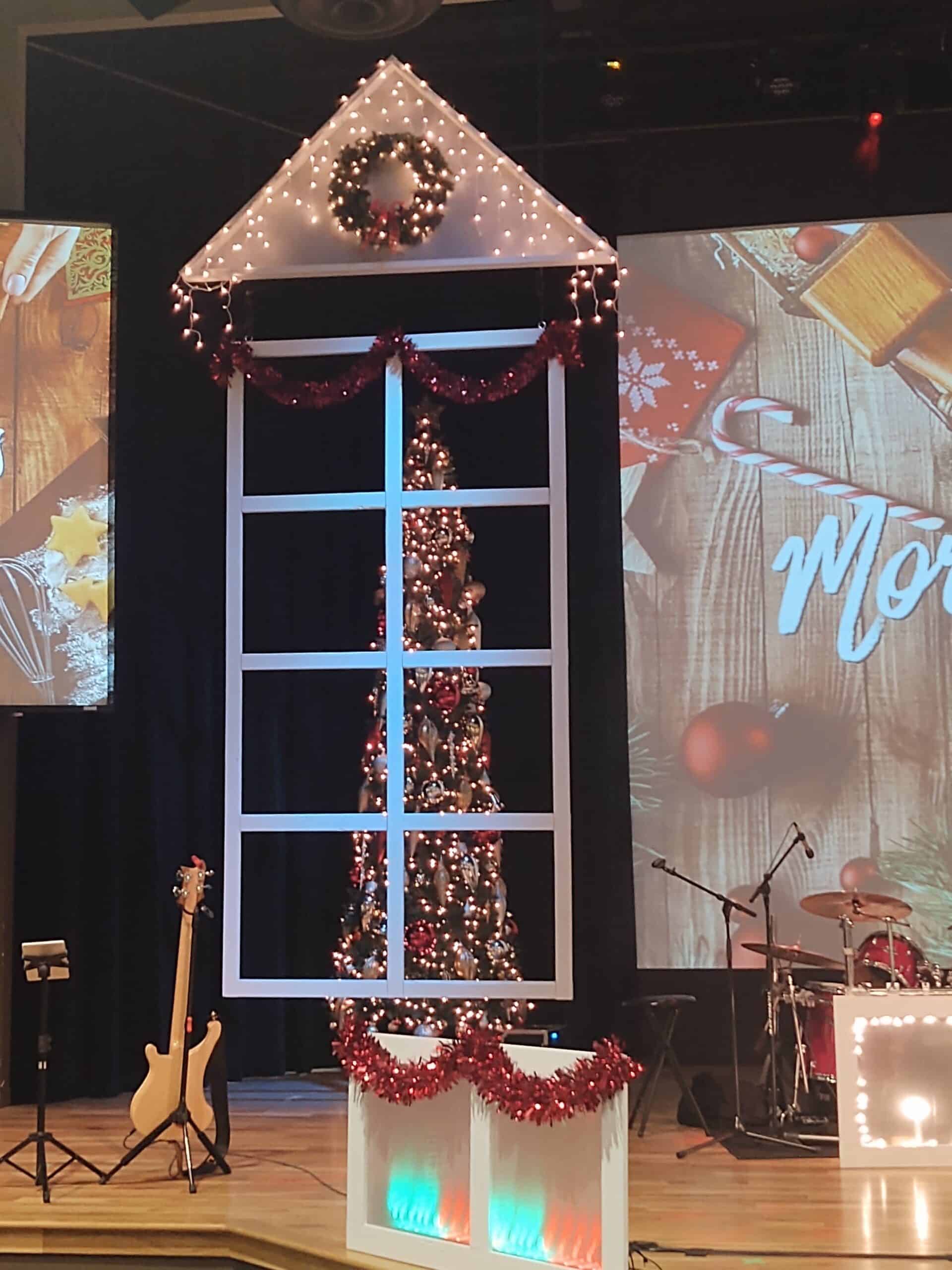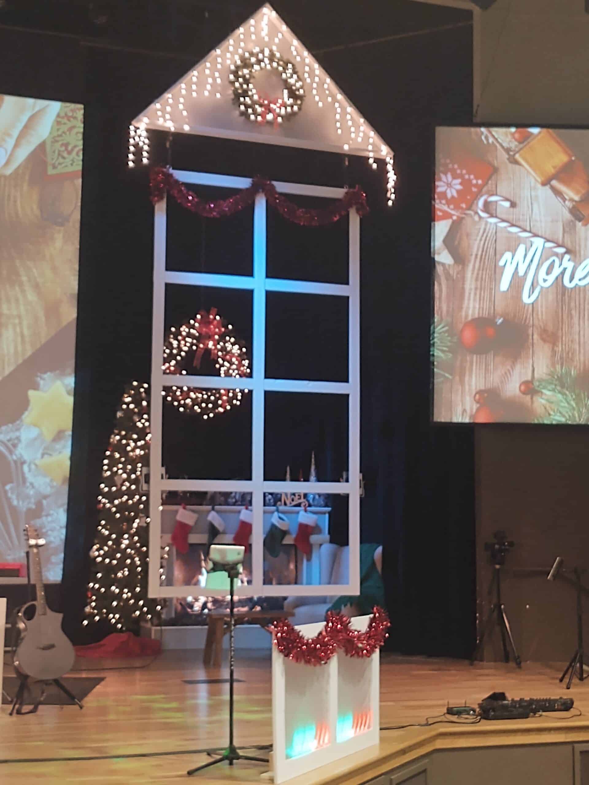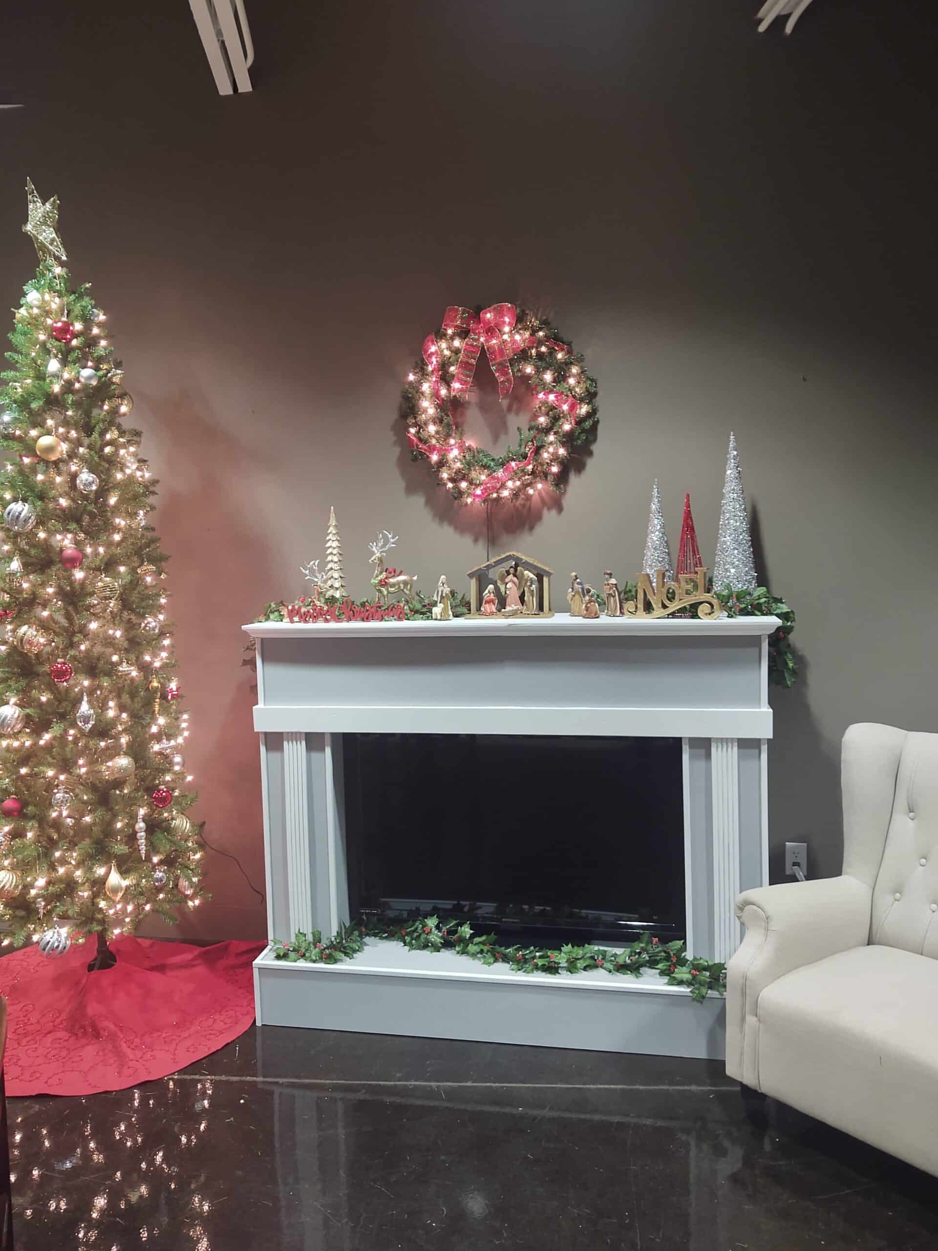 On the other side of the stage we created a living room. We borrowed a chair from our lobby, we purchased a 9’ skinny Christmas tree from Amazon for $200. Then we created a fireplace. I do not have details on how we made this as my guys invited it as they went. Basically, it is 5’tall, 6’wide, and a foot deep. We walked through the lumber store and picked up trim to create a fancier look and used thin plywood for the sides, front, and tops. We painted the fireplace grey and the trim white so that it popped and would pick up light from the lighting team. We placed a TV inside (not being used elsewhere in the building), set back to look more realistic we plugged in a thumb drive with a “fire” that we turned on during services. We added decorations on top including a nativity. We hung a large wreath above the fireplace using the same red ribbon as the outdoor wreaths, added stockings, some strings of fake holly, a blanket on the chair, and ta-da! We did recreate the same living room in our lobby for selfies with a donated TV.