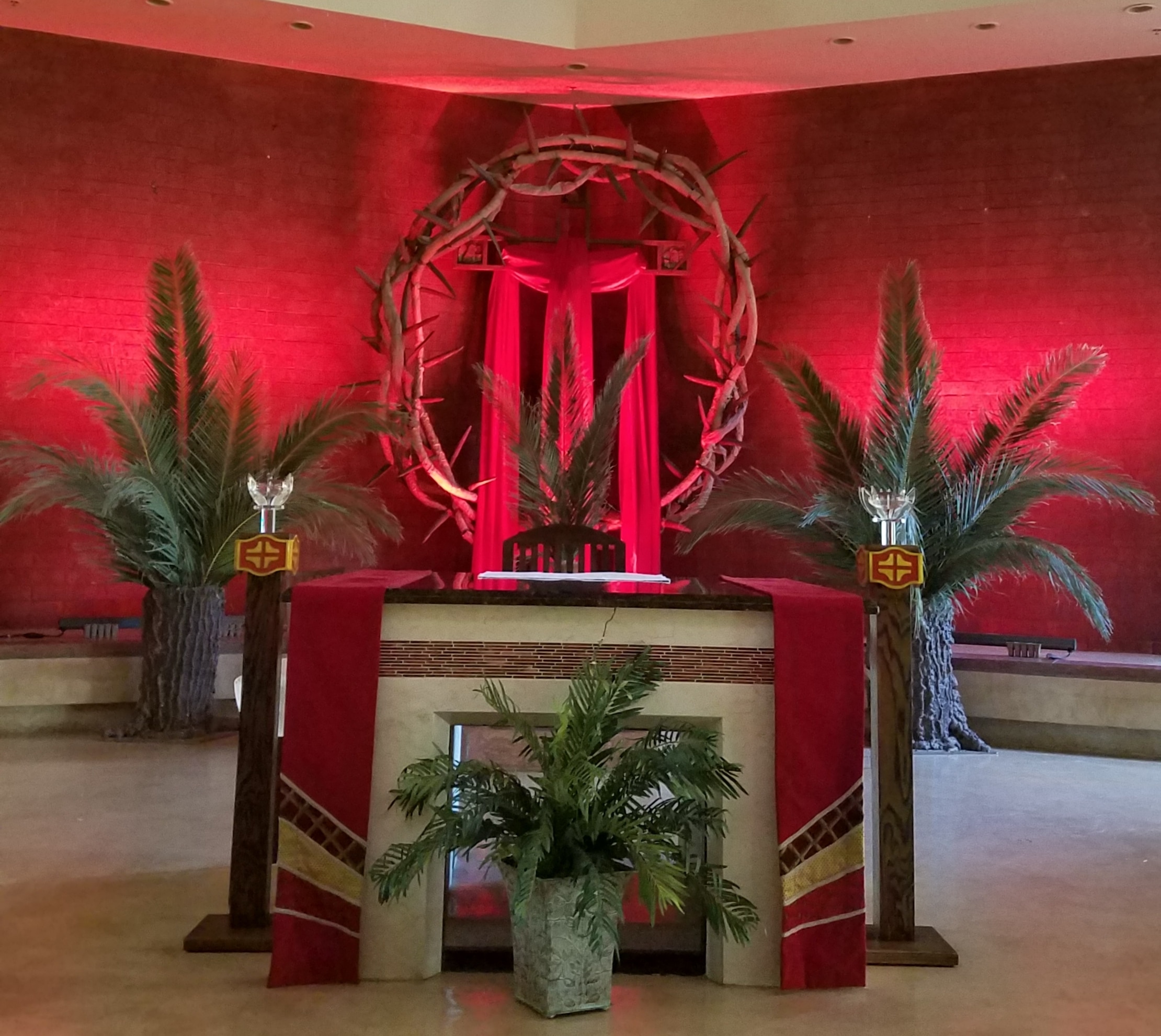 The crown of thorns was displayed on Ash Wednesday and throughout lent. On Palm Sunday we covered the cross with red material and added palms to the altar. Fake tree trunks that I made, were used to hold the palms. We progressed the crown through holy week starting on Holy Thursday with water flowing through the crown using blue gossamer and for water pouring out of clay vessels, we used blue/green mesh all symbolizing washing feet. Then on Good Friday we shined red lights and placed a cross in front of the altar draped in red material, which was then removed during mass. Finally, the crown of thorns was transformed by taking off the thorns and adding flowers to symbolize new life and celebrating the resurrection of Christ at Easter. The flowers were zip tied onto the vines, which allows for easy removal without damaging the vines.