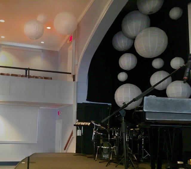 The lanterns over the audience were hung from fishing line threaded through the ceiling from the attic and each lit by an American DJ Inno Pocket z4.