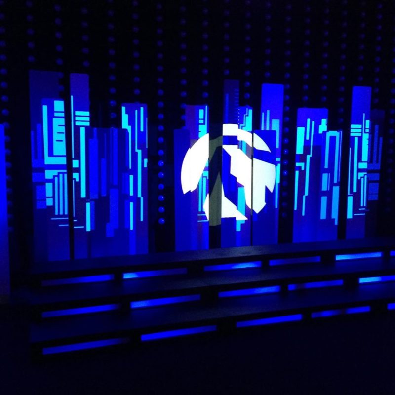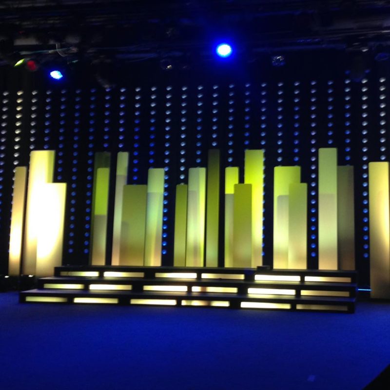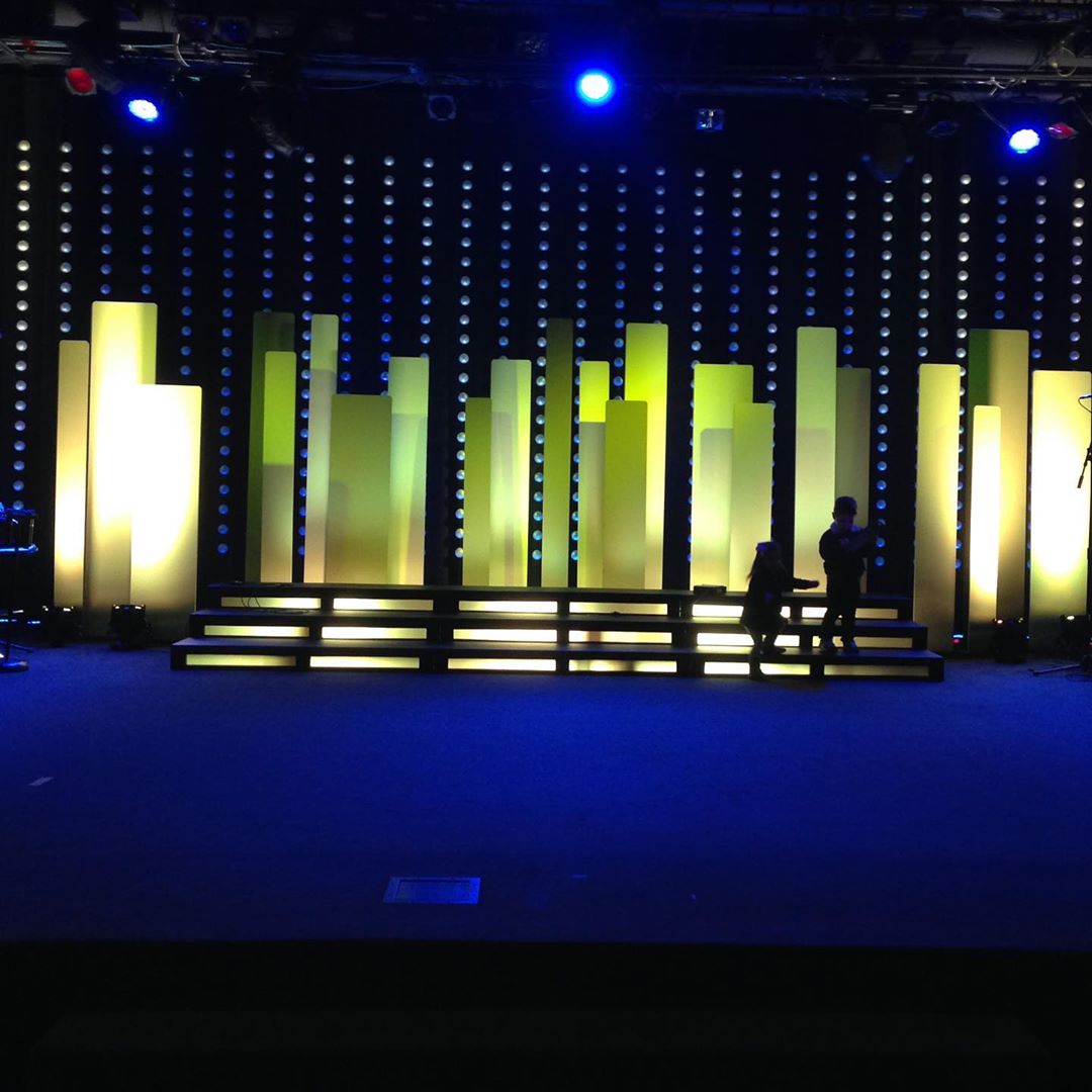 This was 3/4” MDF (medium-density fiberboard) ripped into different widths and heights. They made bases from wood to stand up and arranged them to their liking. They painted the pieces a grayscale egg shell sheen. At the time (2014), they projected their church logo with vintage highend DL2 ML lights. They also strung hundreds of white playground balls in the background.