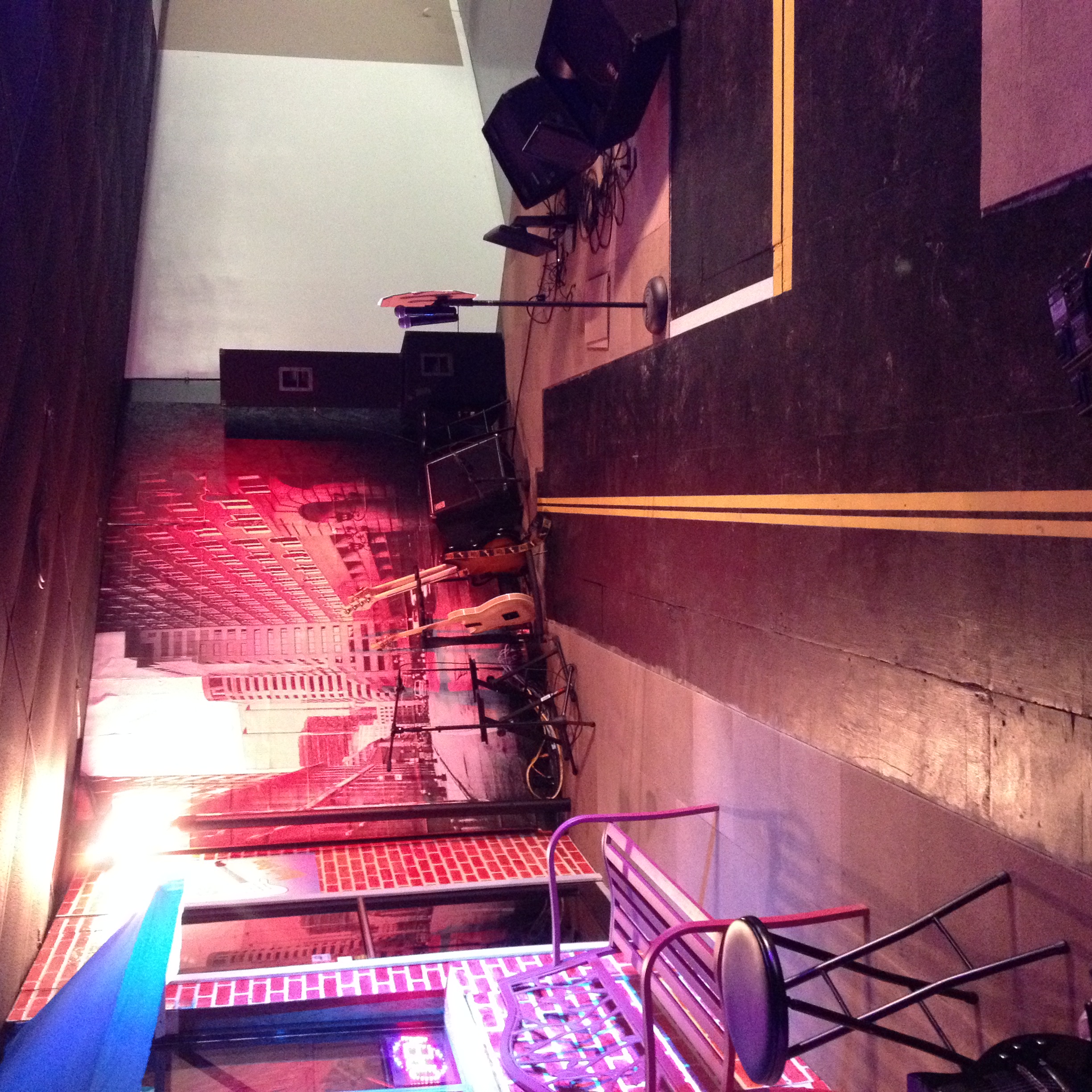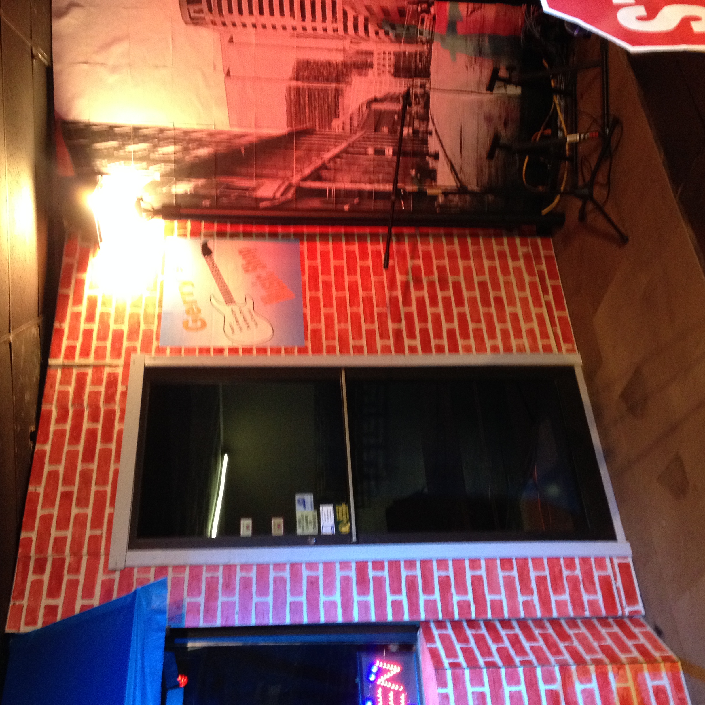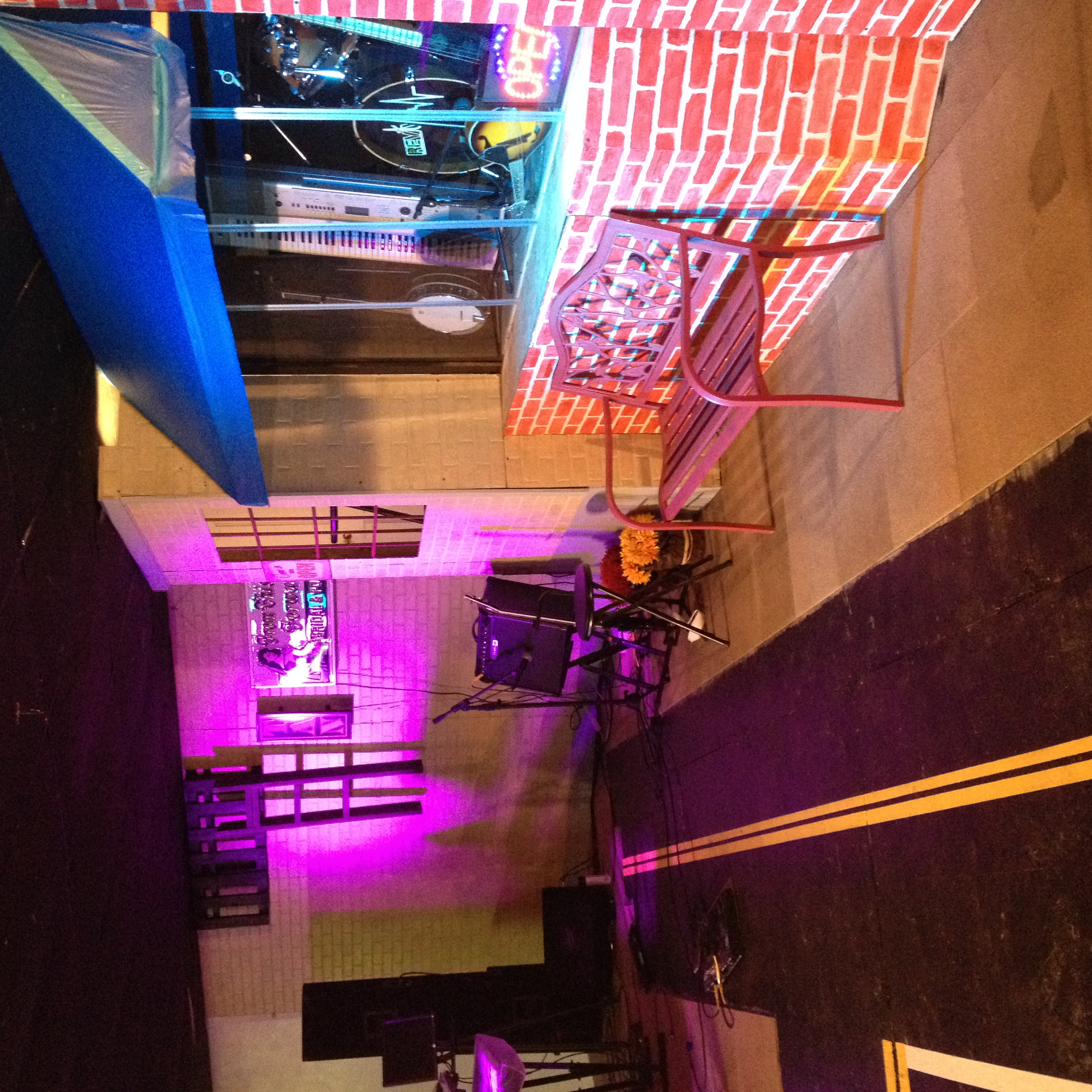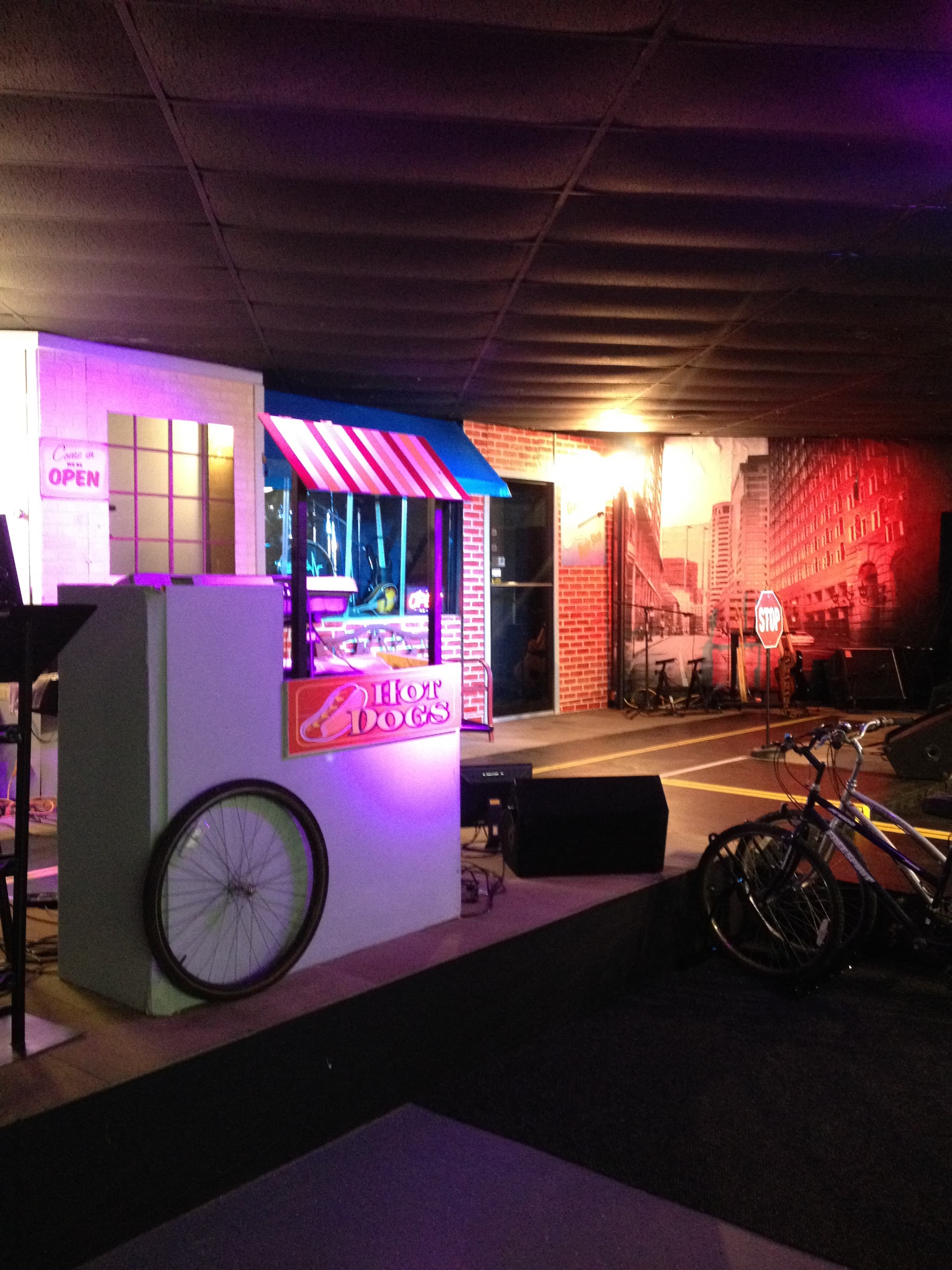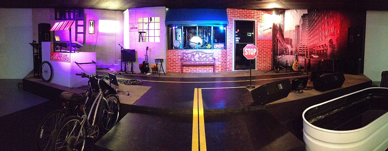 All of the brick they used were panels they purchased from a local re-use store. They painted one of the storefronts bricks to break up the colors and buildings. Their stage carpet was pulled up and plywood underneath was painted black and yellow to look like a road. Their right side wall was filled up by taking a picture and printing it out using a software that makes puzzle like print outs. They had to put up every sheet to make the city scene. Very cost effective, but a lot of work. They added other details, like bike racks, stop signs, etc. The build was completed in two days.