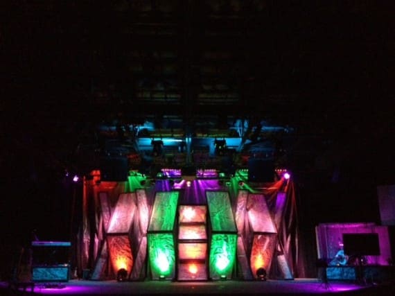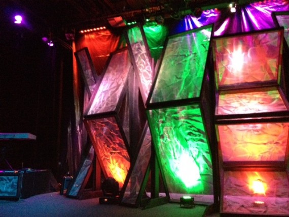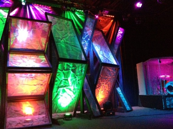 Their stage space was limited so they needed to create a different look by placing it structure in a small arch. They used 2×4’s for the boxes covered with aluminum screen material. The side braces were free standing and constructed out of 2×6’s.