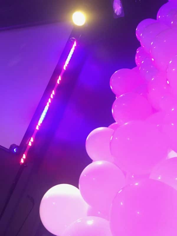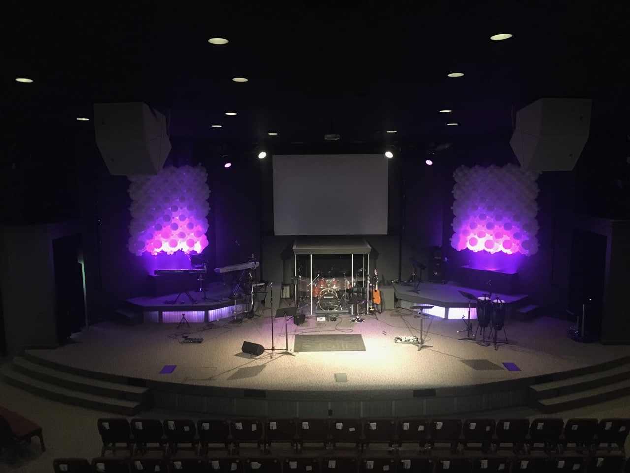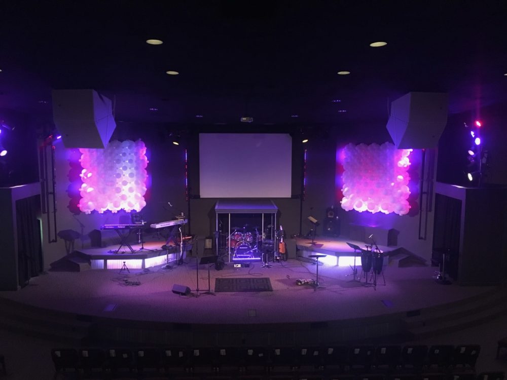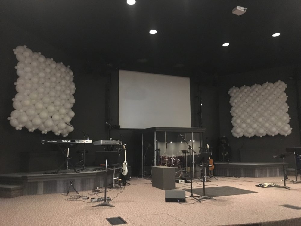 They wanted a fun but modern stage design for their series, “Church is a Party!” They had hardly any budget and only one week to make it happen. They had connections with a professional balloon designer who had done balloon animals at a church event. She also designs large balloon decor, so Devin told her they wanted a wall of balloons with alternating sizes.