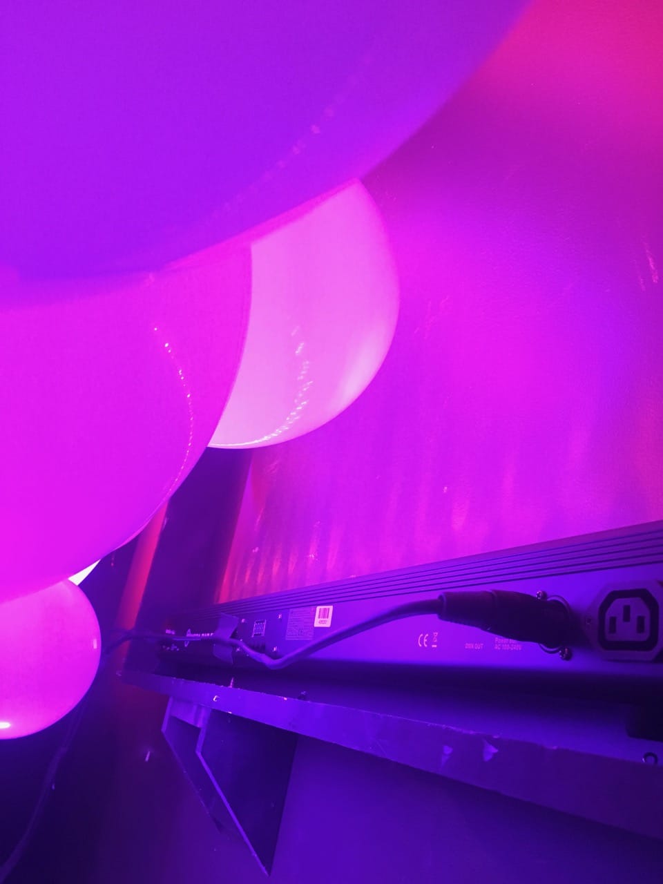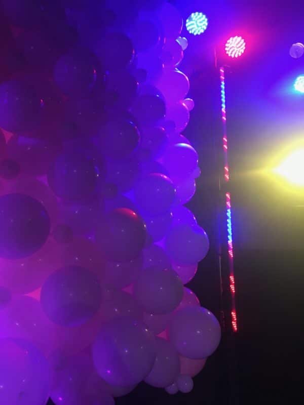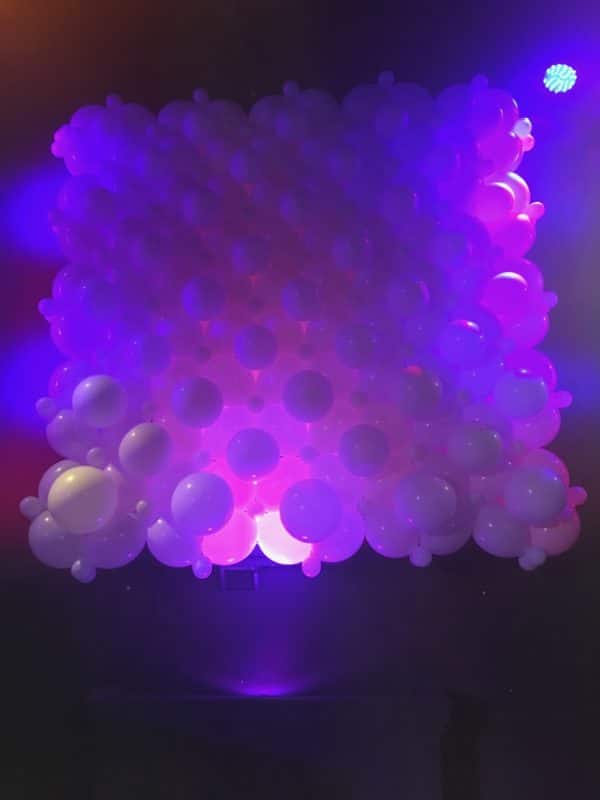 They had a few volunteers help air up the balloons with machines. She provided all of the supplies. Most balloon artists could provide this service at an affordable cost. Total time was 4 hours. They hung the balloon wall with fishing line from all four corners. They chose white to reflect the light from the LED light bars. They had 2 light bars on either side of the balloon wall, and one light bar at the bottom, behind the balloon wall, pointing up to light the center of the balloons.