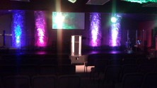 They took down a beat-up metallic wall behind the stage, and repainted the wall to a neutral grey color. Then they introduced hung sheets of crinkled aluminum screening as columns on sides of the stage. These bad boys were lit with four par 64 LED’s from the ground.