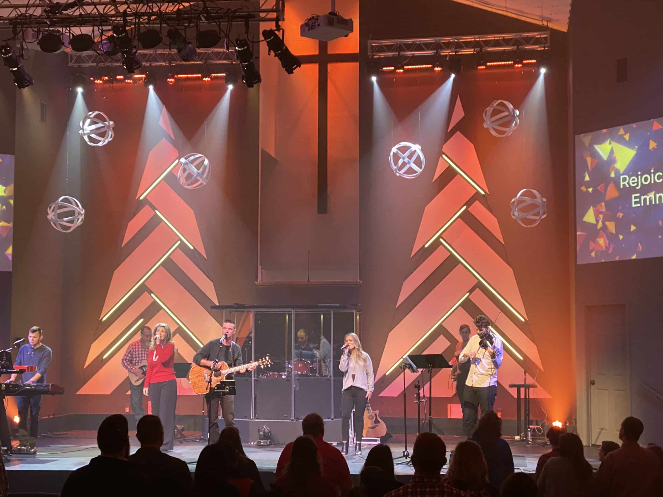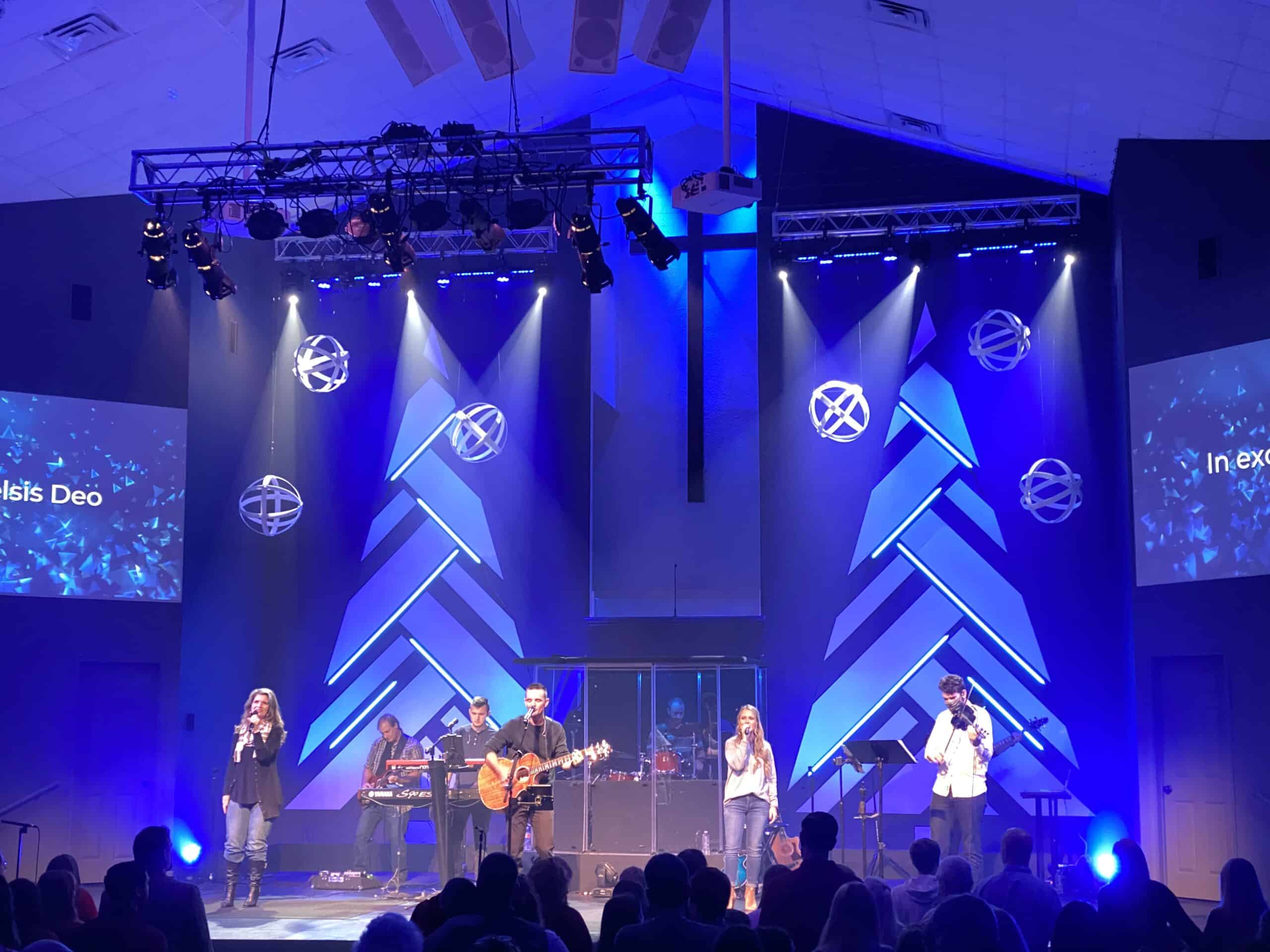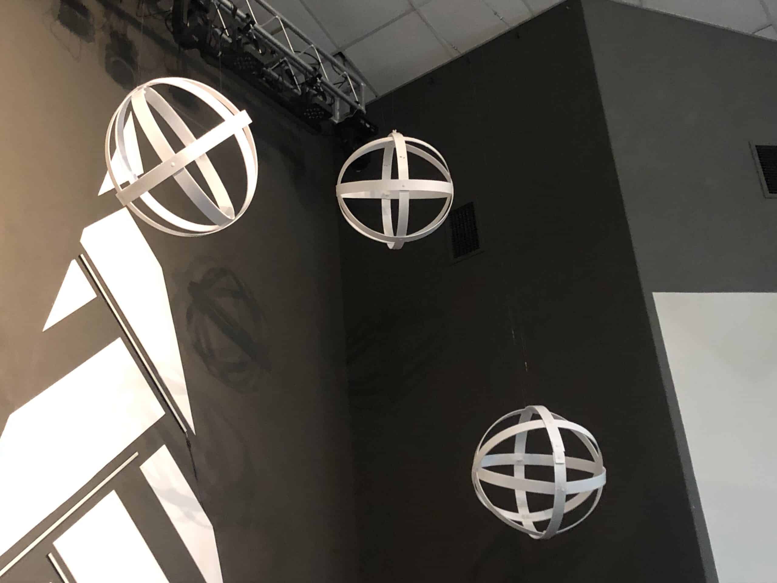 We felt like there was too much open space at the top so we added hanging “ornaments” to fill in the space and add depth to the design. The ornaments were 2′ in diameter and were made with 2″ strips of Coroplast. We assembled them with nylon hardware (bolts and wingnuts). We hung them from different points and different angles on the ornaments to give them all a different feel/look. We also hung them at different distances from the wall to give more depth. We then used a couple of wash intimidators to light them. A couple of lessons learned with these: We had seen others do the ornament design and many appeared to be larger in diameter. With the thickness and width strips we used, we found that any larger than the 2′ diameter started warping and distorting. Also, we cut some 1.5″ x 5″ pieces of Coroplast to “bracket” each connection where our strips came together. This helped to reinforce the connection and keep the shape more true and consistent.