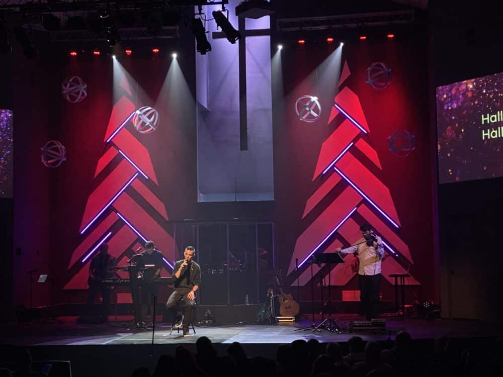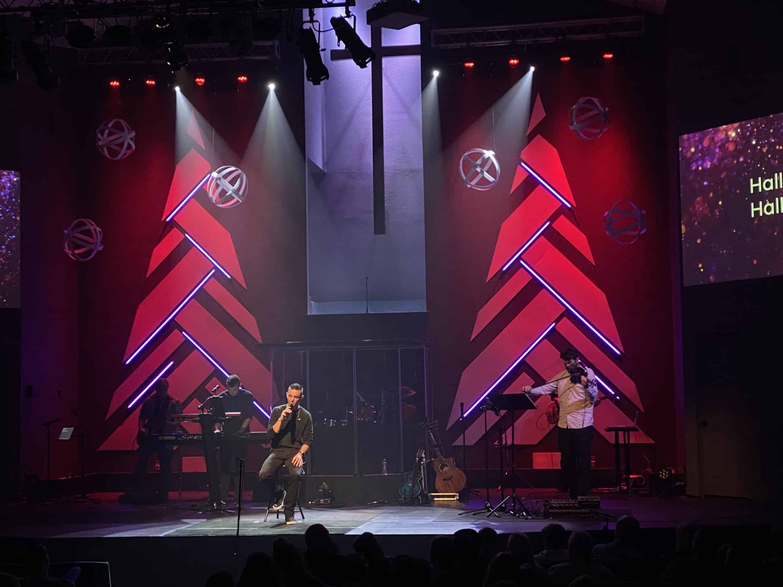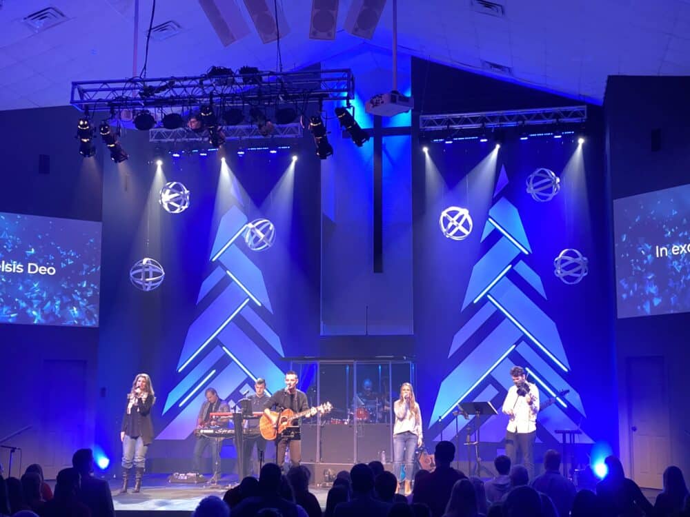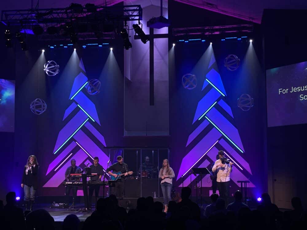 We felt like there was too much open space at the top so we added hanging “ornaments” to fill in the space and add depth to the design. The ornaments were 2′ in diameter and were made with 2″ strips of Coroplast. We assembled them with nylon hardware (bolts and wingnuts). We hung them from different points and different angles on the ornaments to give them all a different feel/look. We also hung them at different distances from the wall to give more depth. We then used a couple of wash intimidators to light them. A couple of lessons learned with these: We had seen others do the ornament design and many appeared to be larger in diameter. With the thickness and width strips we used, we found that any larger than the 2′ diameter started warping and distorting. Also, we cut some 1.5″ x 5″ pieces of Coroplast to “bracket” each connection where our strips came together. This helped to reinforce the connection and keep the shape more true and consistent.