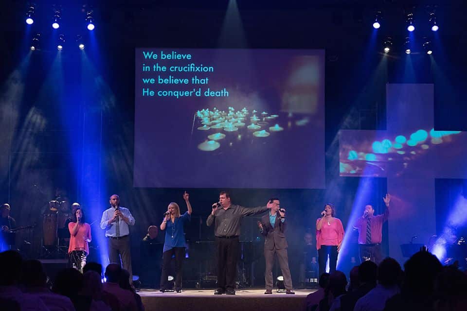 This Easter stage designed was based on 2 projection areas—the large screen (center wall) and a large cross. During baptisms, testimonies were projected inside the cross.