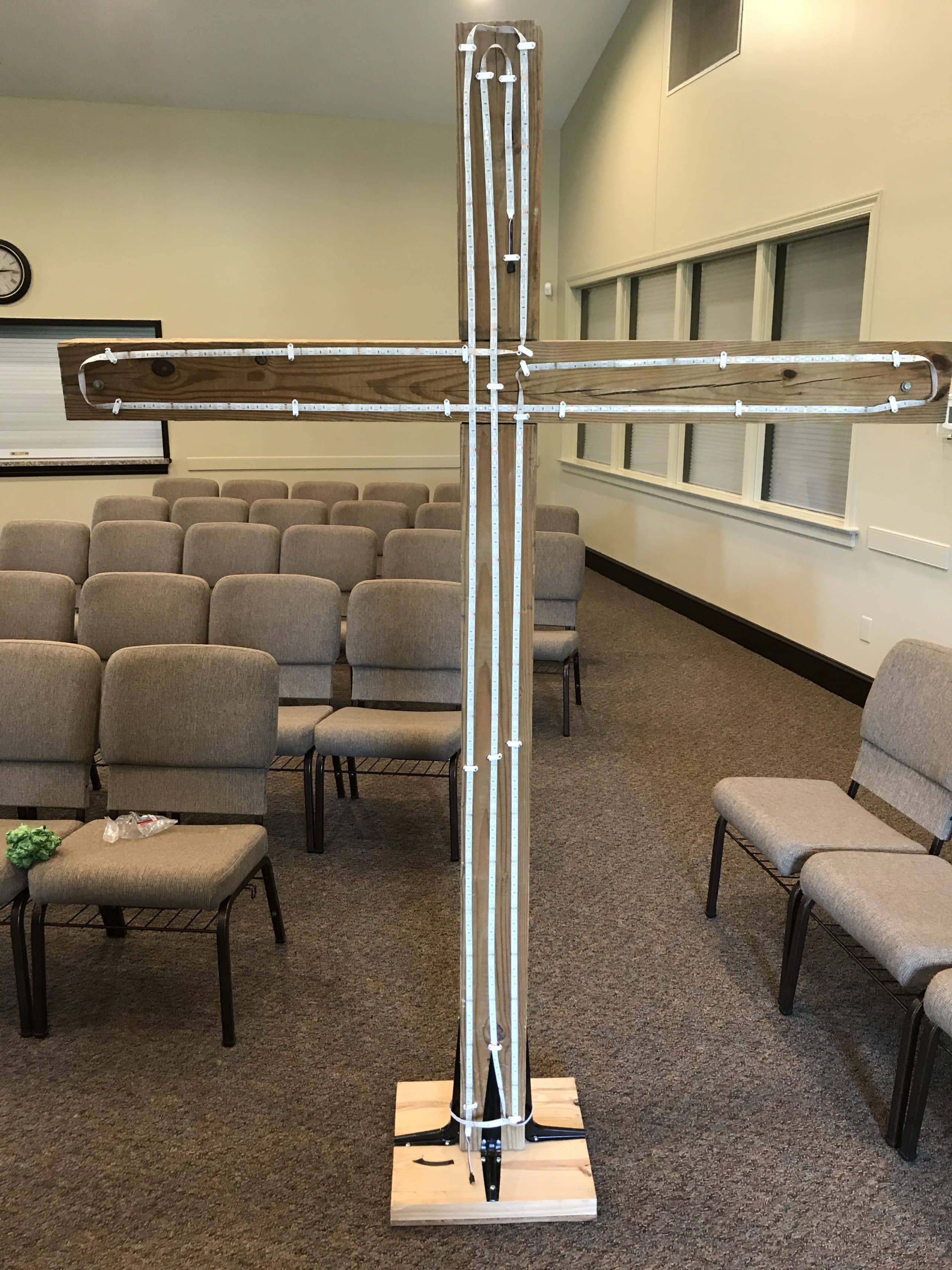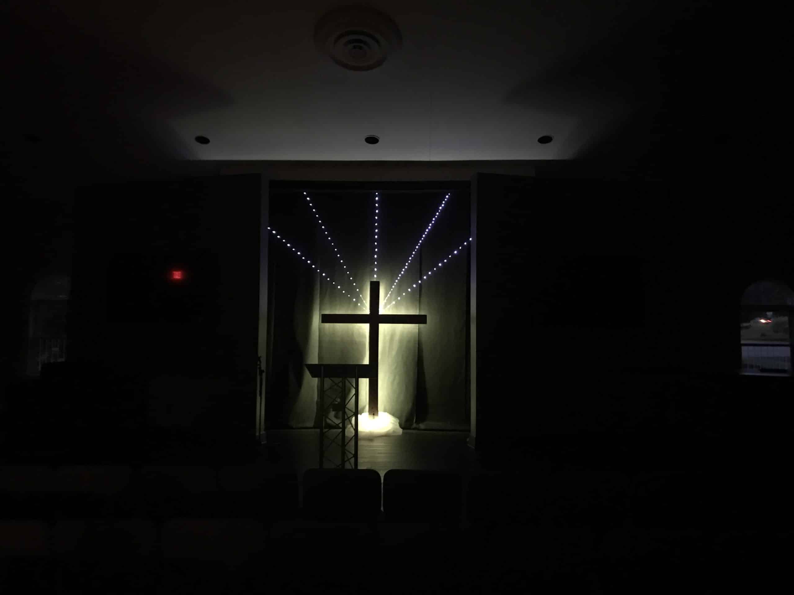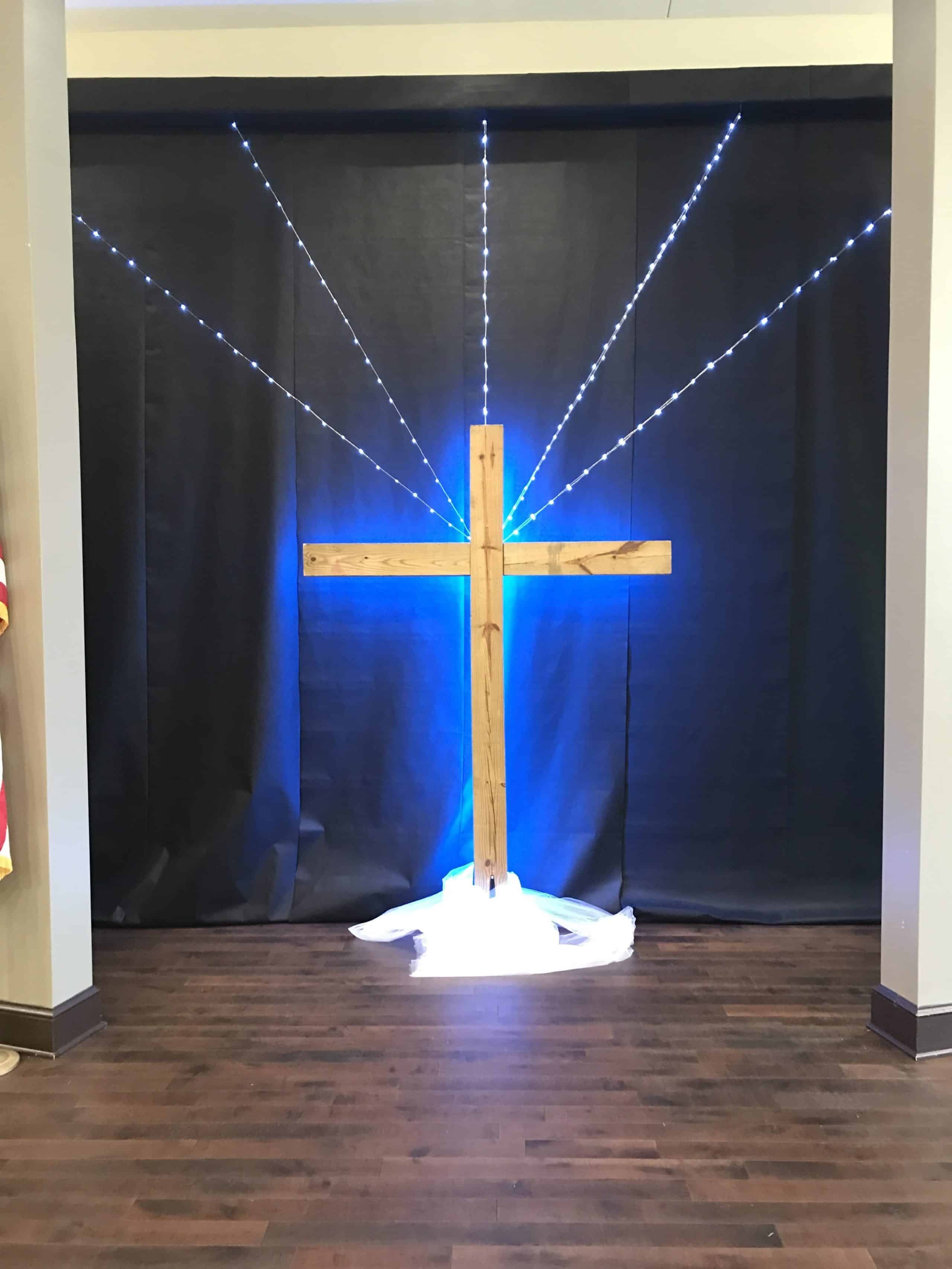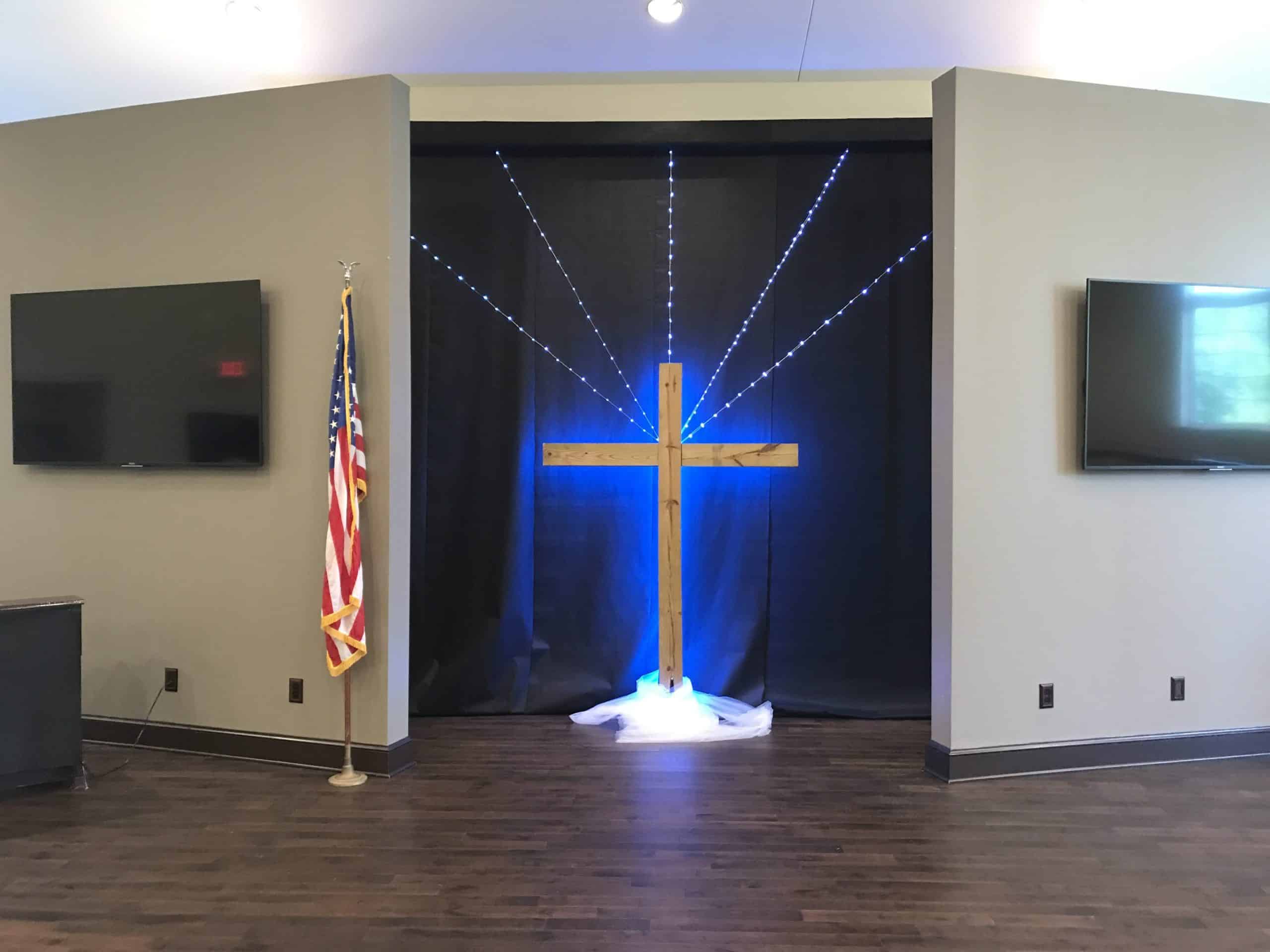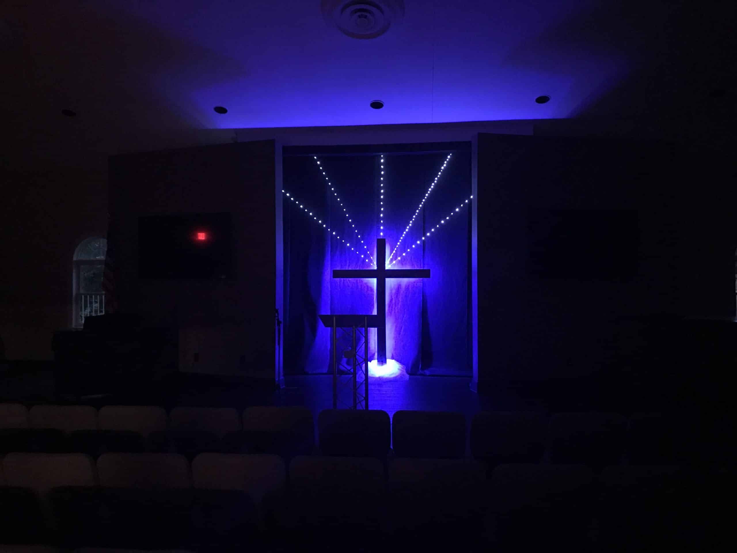 They needed a simple stage design to use between their last series and the holidays. They already had a wooden cross in storage. They lined the back of the cross with LED strips that they could control via Bluetooth. Running from the cross to their overhead beam they attached white LED twinkle lights.