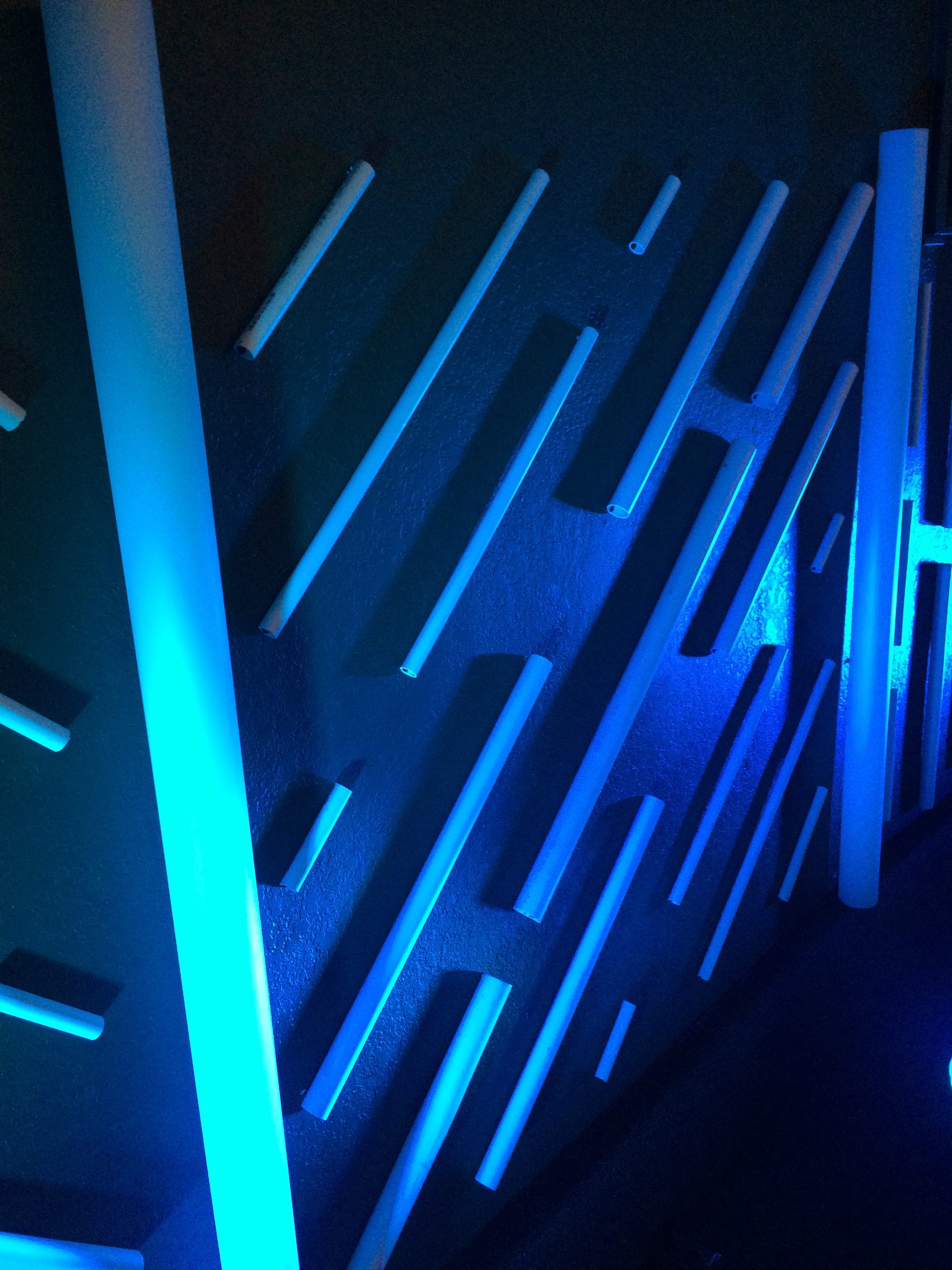 To create this, they simply screwed bits of PVC pipe into their back wall. It was various sizes and various arrangements to give them this pattern.