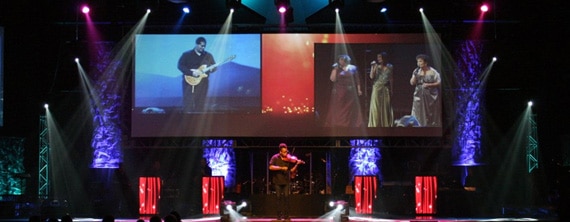 They used a 10’x30′ screen projected onto using 3 Panasonic 5000 lumen projectors. They got a seamless look using the edge blending module in ProPresenter. To add some extra flare on the stage they stood up 4 47” LCD screens vertically and used Pro Video Player to drive the content for those screens. The advanced features in PVP allowed them to easily set up the content to show on the vertical screens.