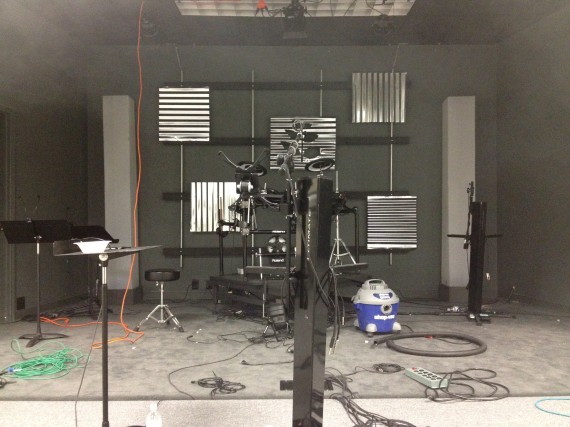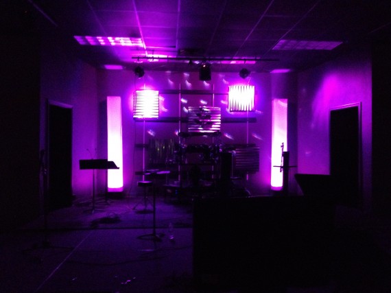 They lit each piece with simple color wash LED par cans – the top half suspended and the bottom half sitting on the stage. The entire project took only a couple hours to construct and install and cost around $75. All the materials were purchased at a local hardware store and Home Depot.
