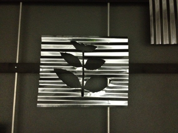 After the entire piece was suspended the corrugated metal was cut into roughly square pieces with simple tin snips and attached to the frame with self tapping sheet metal screws. The church leaf logo was traced and cut out with the tin snips in the middle piece before it was installed.
