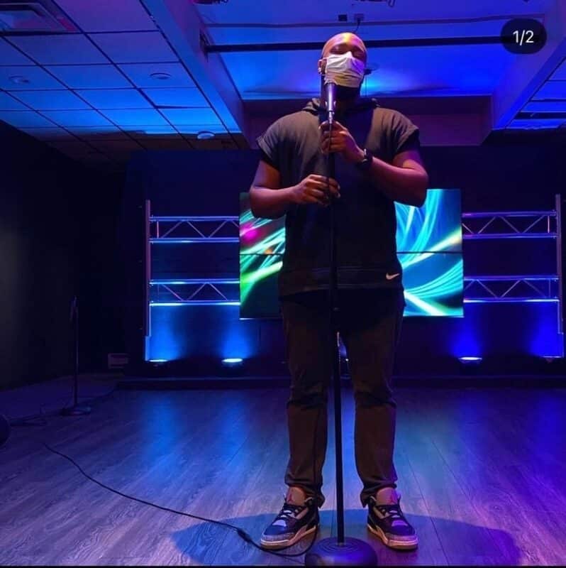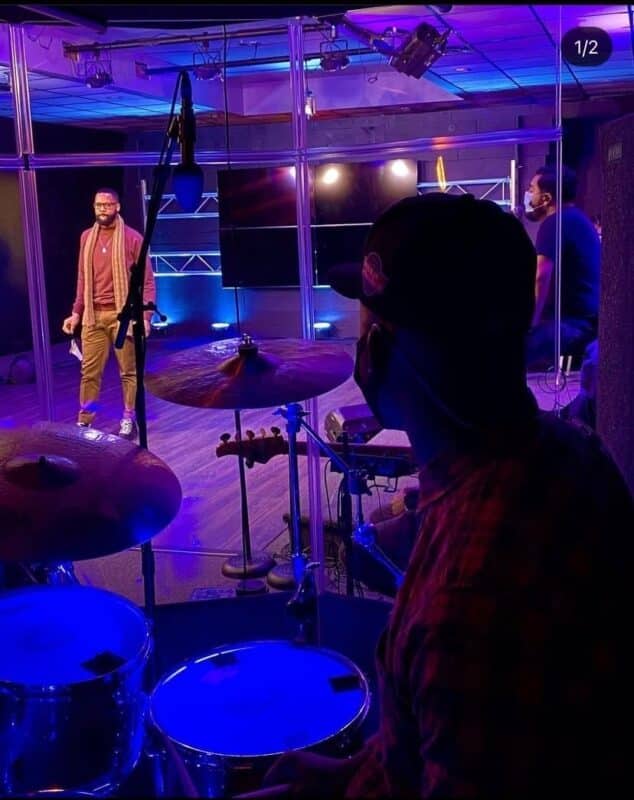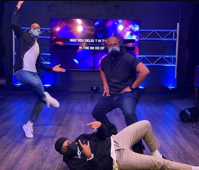To make room for social distancing guidelines and the requirement to livestream because of COVID, they created this set. It’s simple trussing with TV’s clamped onto it, set up on a track so they can move them around along the truss. Then they purchased a faux wood floor from Lowe’s to. are it feel like a dance floor.