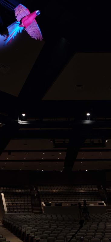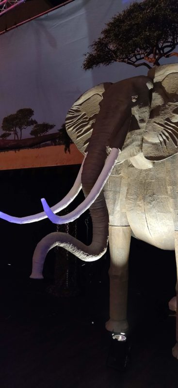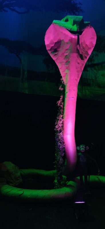 On top of the amazing creatures, we had a wonderful 5 man construction team that built the 25ft tall tree onstage covered in slabs from the saw mill. The branches were constructed from 2×4’s and wrapped with butcher paper. The canopy was made from camo netting and faux tree floral. The tree took just under two weeks to build and was assembled in place.