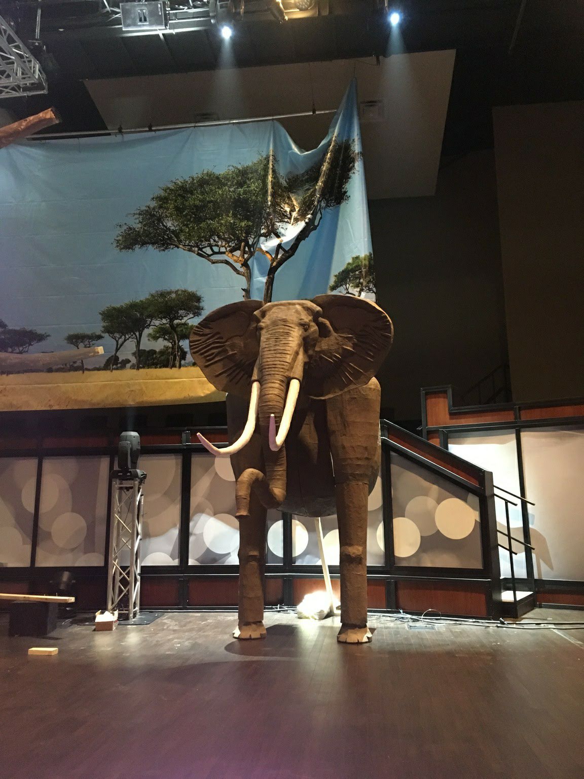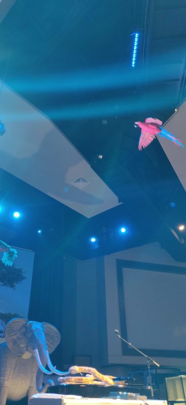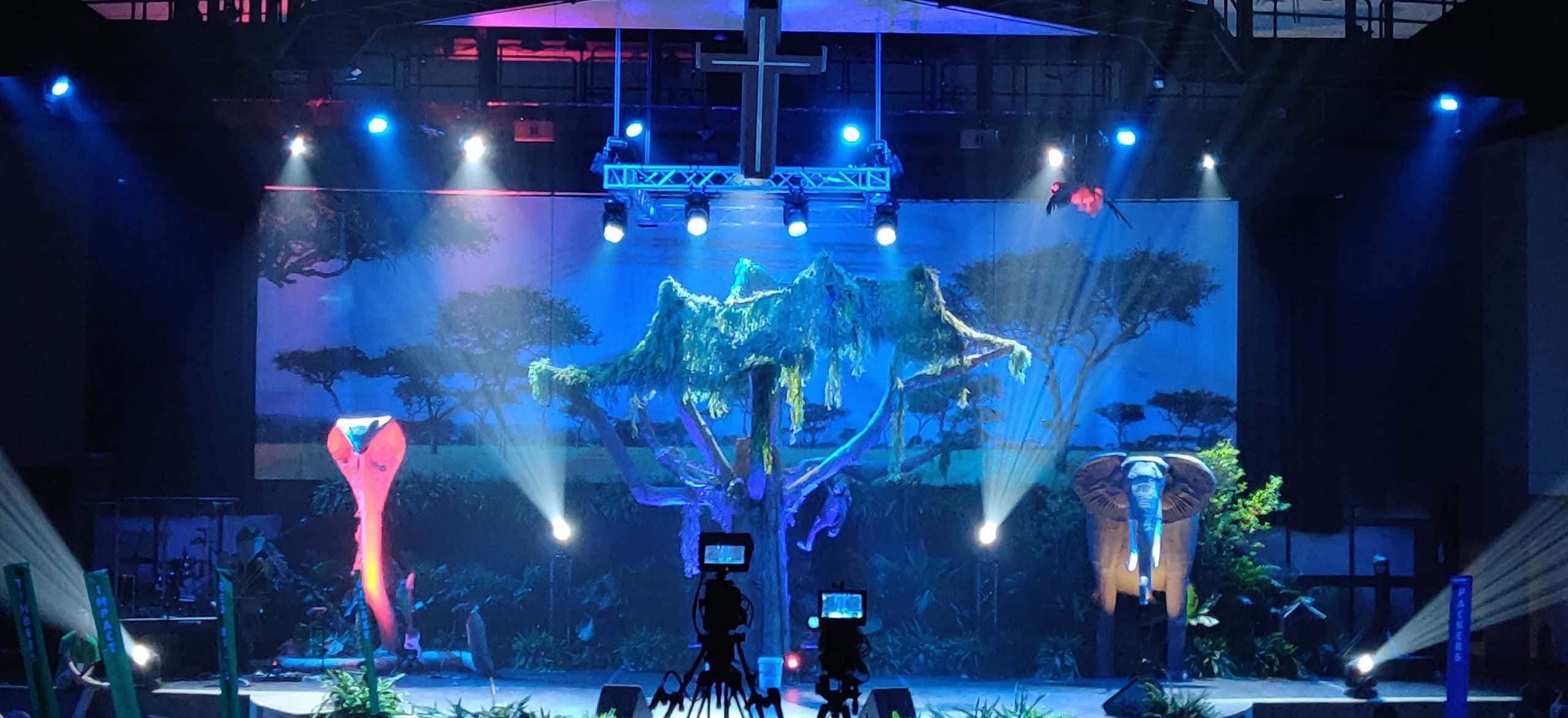 From Chris: Broadmoor’s WOW Week is a VBS experience that turns the Lifeway model to 11. With 1,300 kids attending Monday through Friday from all over the Jackson, MS area it’s an amazing week that consumes the entire church. With the theme for this year “In the Wild” we knew we wanted giant animals on the stage. So in 2018 we asked Mickey Hansen to dream up something big…and big he did. Mickey is an architect by trade, but an artist at heart. Using typical craft supplies – typically cereal boxes, cardboard, butcher paper, wood glue, and 2×4 – his imagination and engineering bring ideas to life.