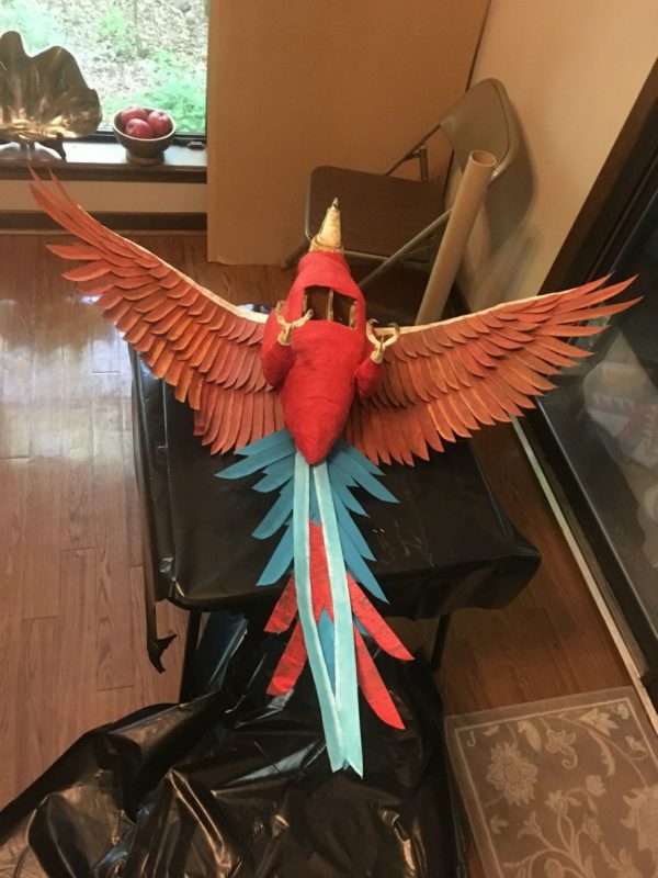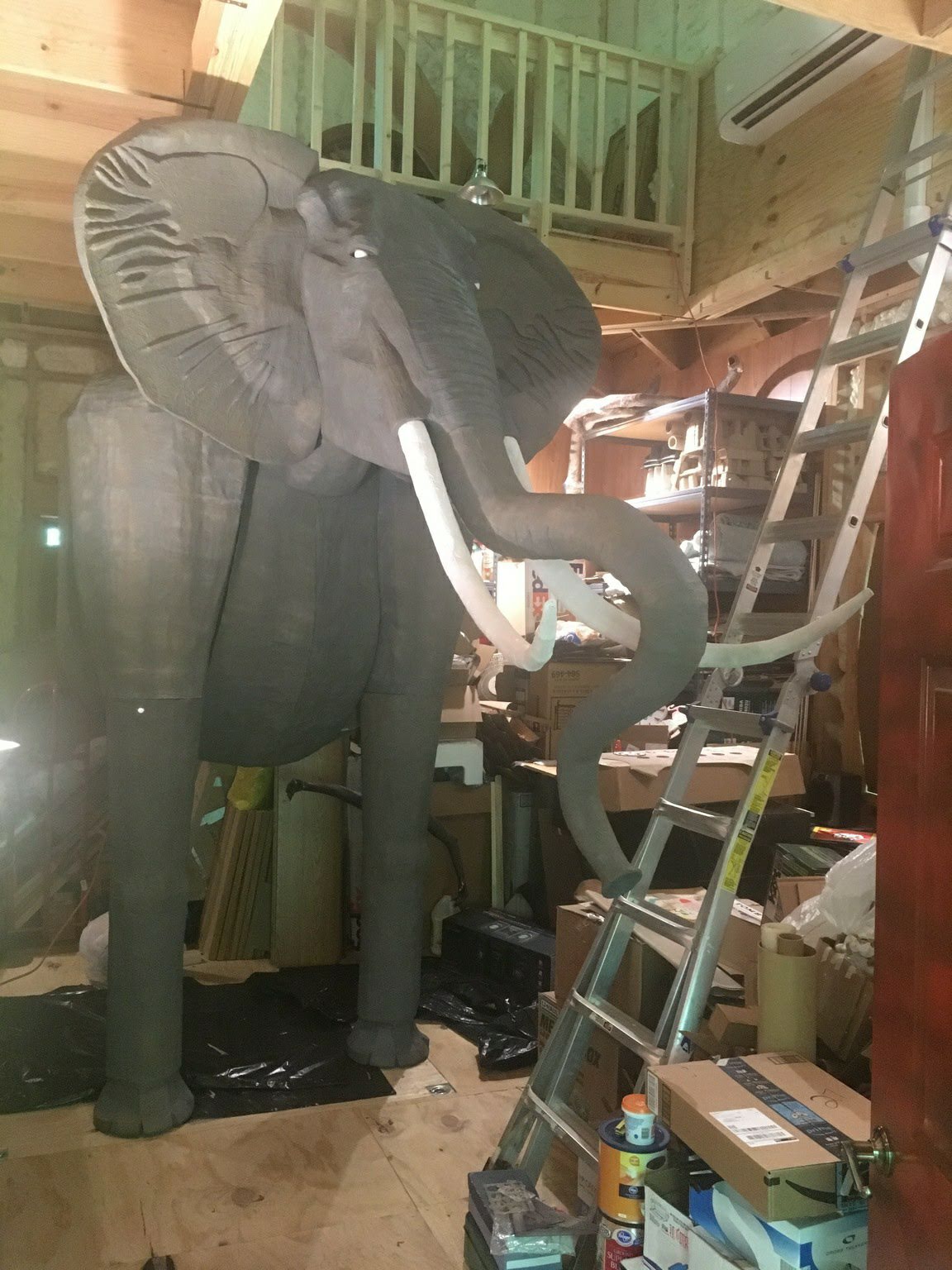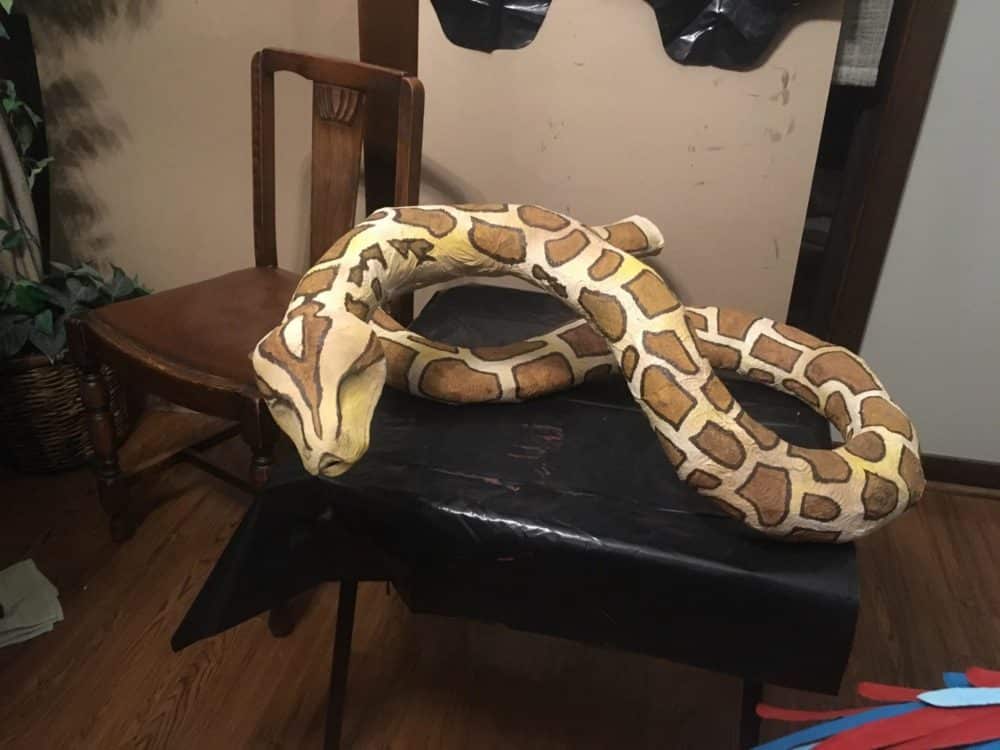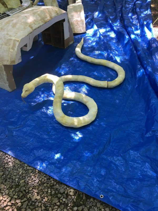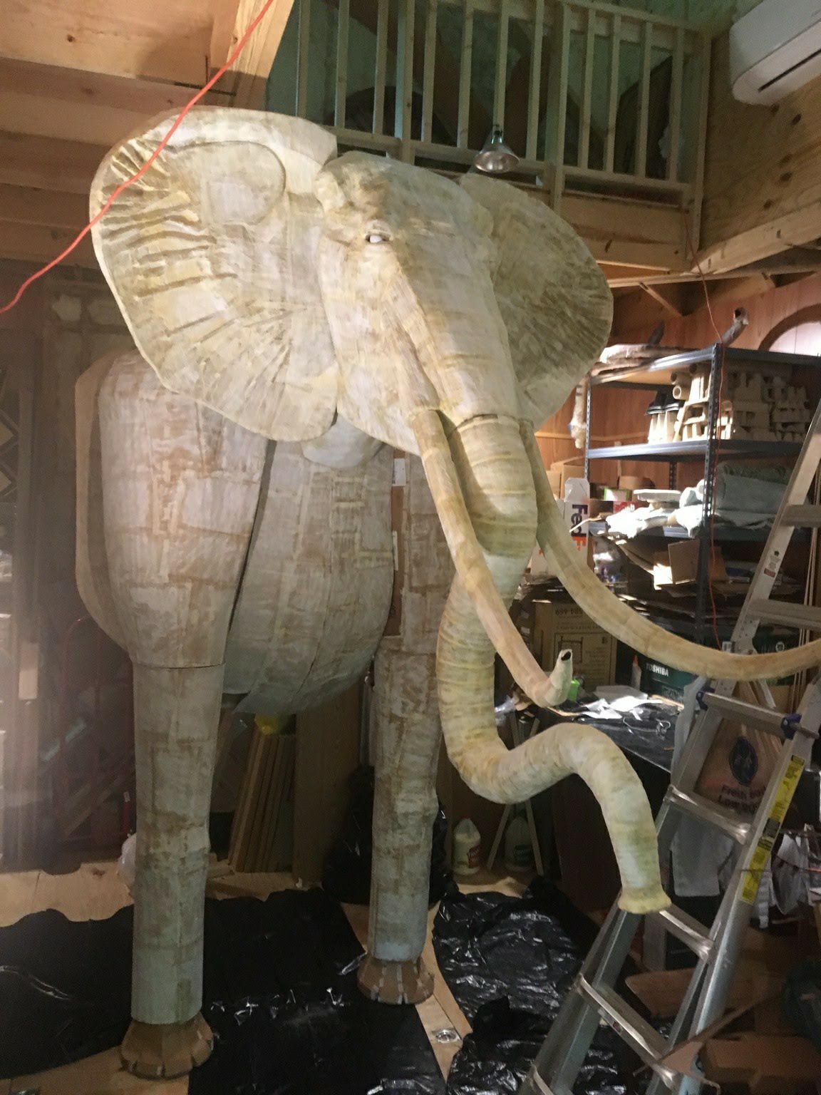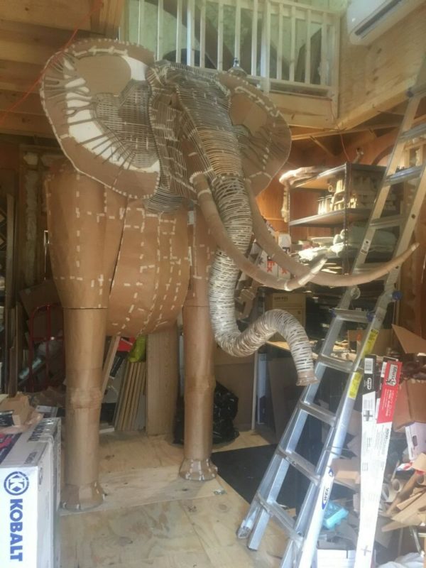 He brought a 13ft tall cobra, 4ft tall monkey, 10ft tall elephant, another low lying snake for the tree, and a 4ft long bird. All cut, formed, and painted by hand with scissors!