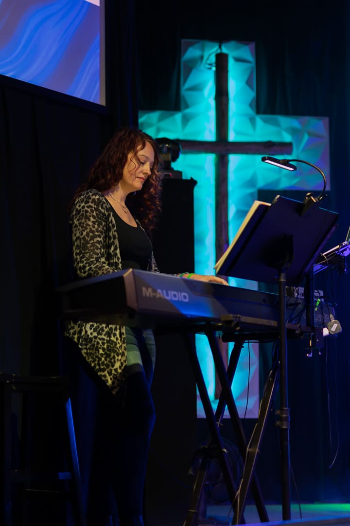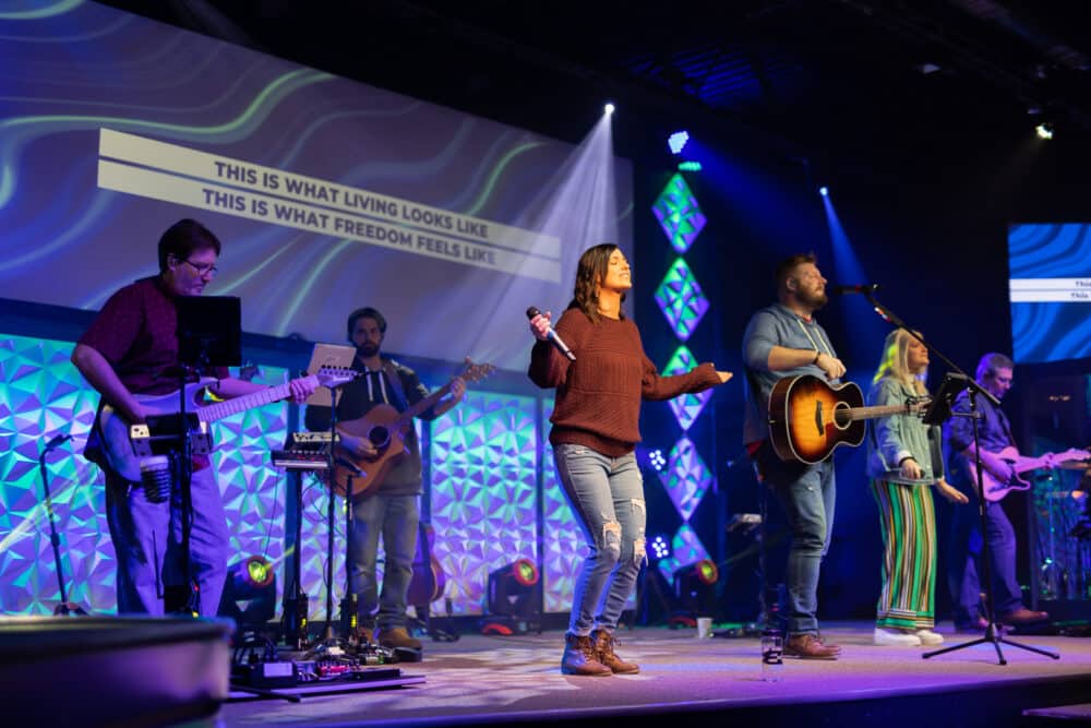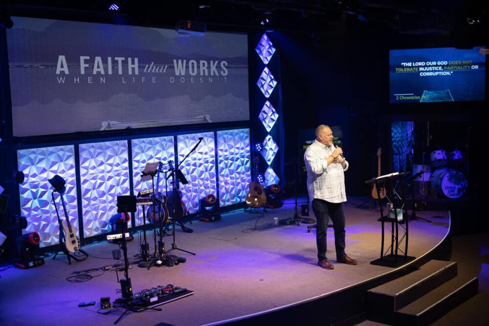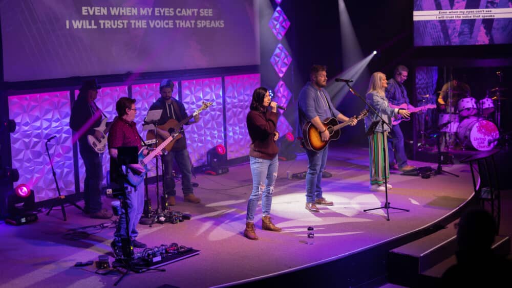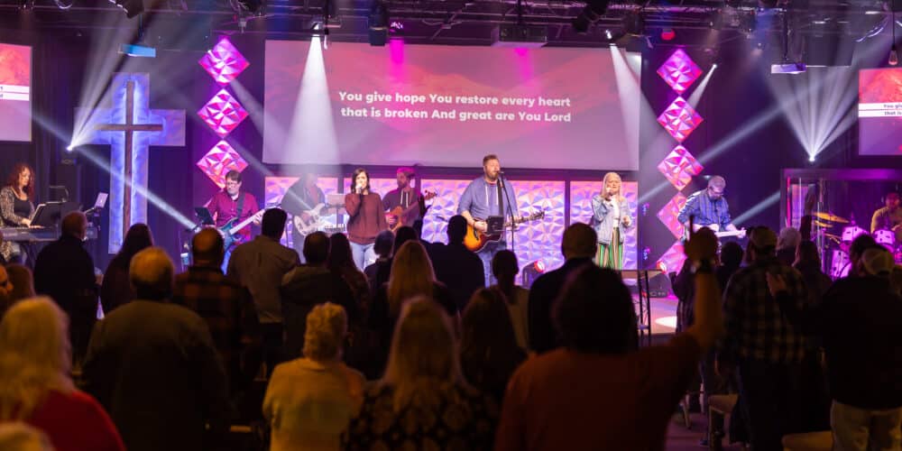 From Joey: We recently moved into this facility and are slowly transforming it into what we want it to be. We painted the entire back wall a flat black color. We also used some curtain that we had left over from some other projects to soften the black wall look. You can see the curtain behind the side screens. When we moved into this facility that had a large screen in the middle that went floor to ceiling. We are still using the same projector, but now we are cutting the image in half in propresenter.