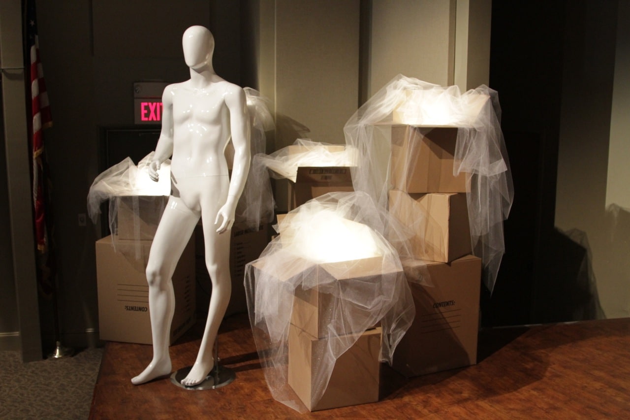 They made it look like they had just been unboxed with energy efficient bulbs because they didn’t want the tulle fabric spilling out of the boxes to melt.