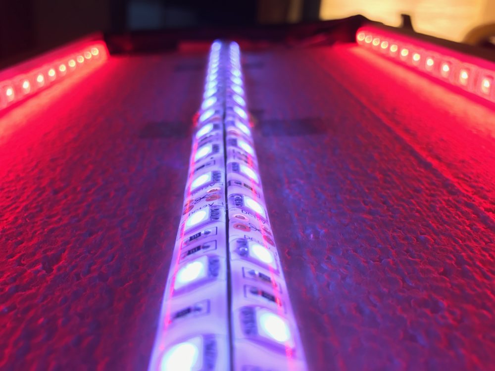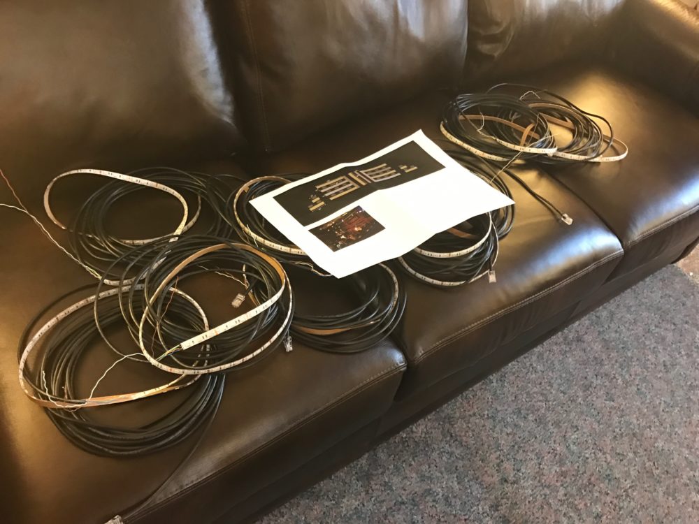 Our design called for 24 light boxes. Each light box consists of a one 1 meter length of RGB SMD 5050 led tape attached to the border of the box and two ~15 inch strips of cold white LEDS attached to a dowel rod in the center of the backboard. The led tape we used came in rolls exactly 5 meters in length, so we were able to create the entire design using a bout 5 full rolls of RGB and 4 rolls of cool white 5050 SMD LEDs. Before purchasing a ton of materials and components, I built a prototype unit to make sure the measurements would work and that we could knock out several more easily. I’m glad we created the prototype because it changed a bunch of the design aspects.
